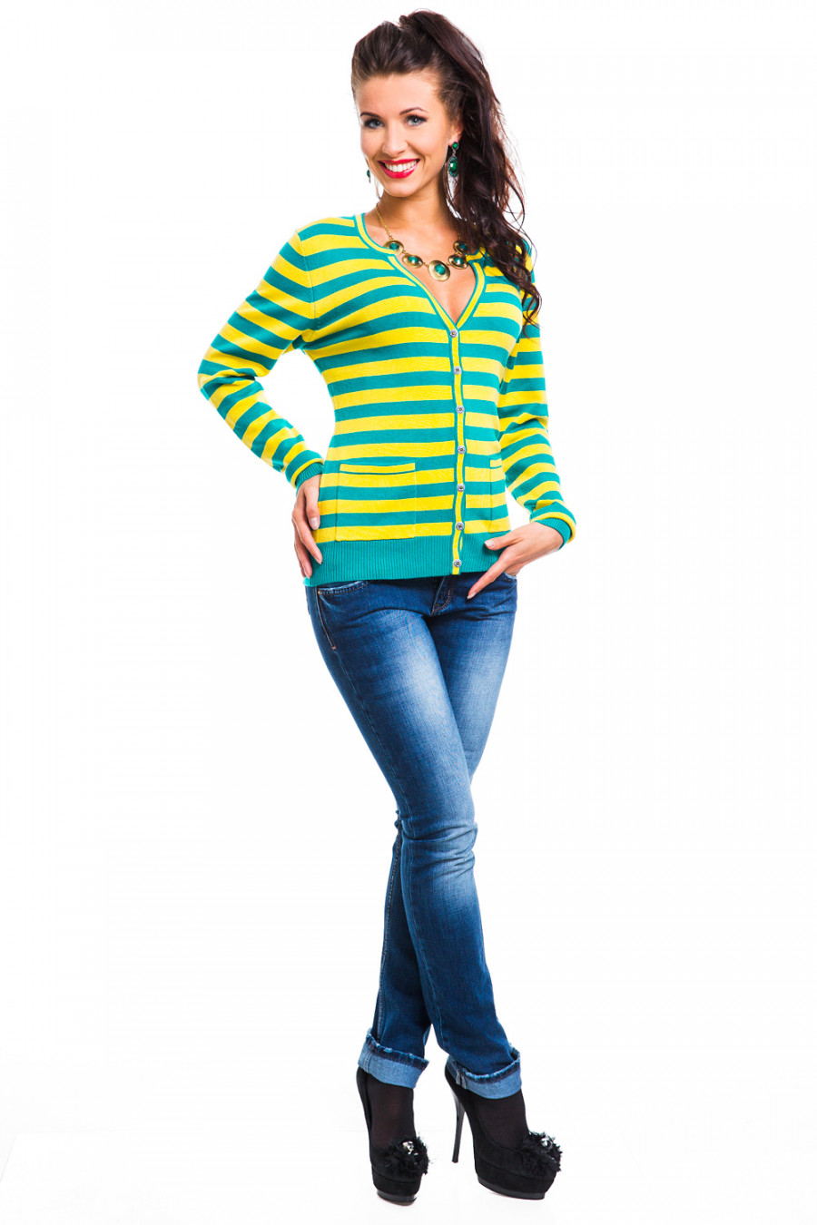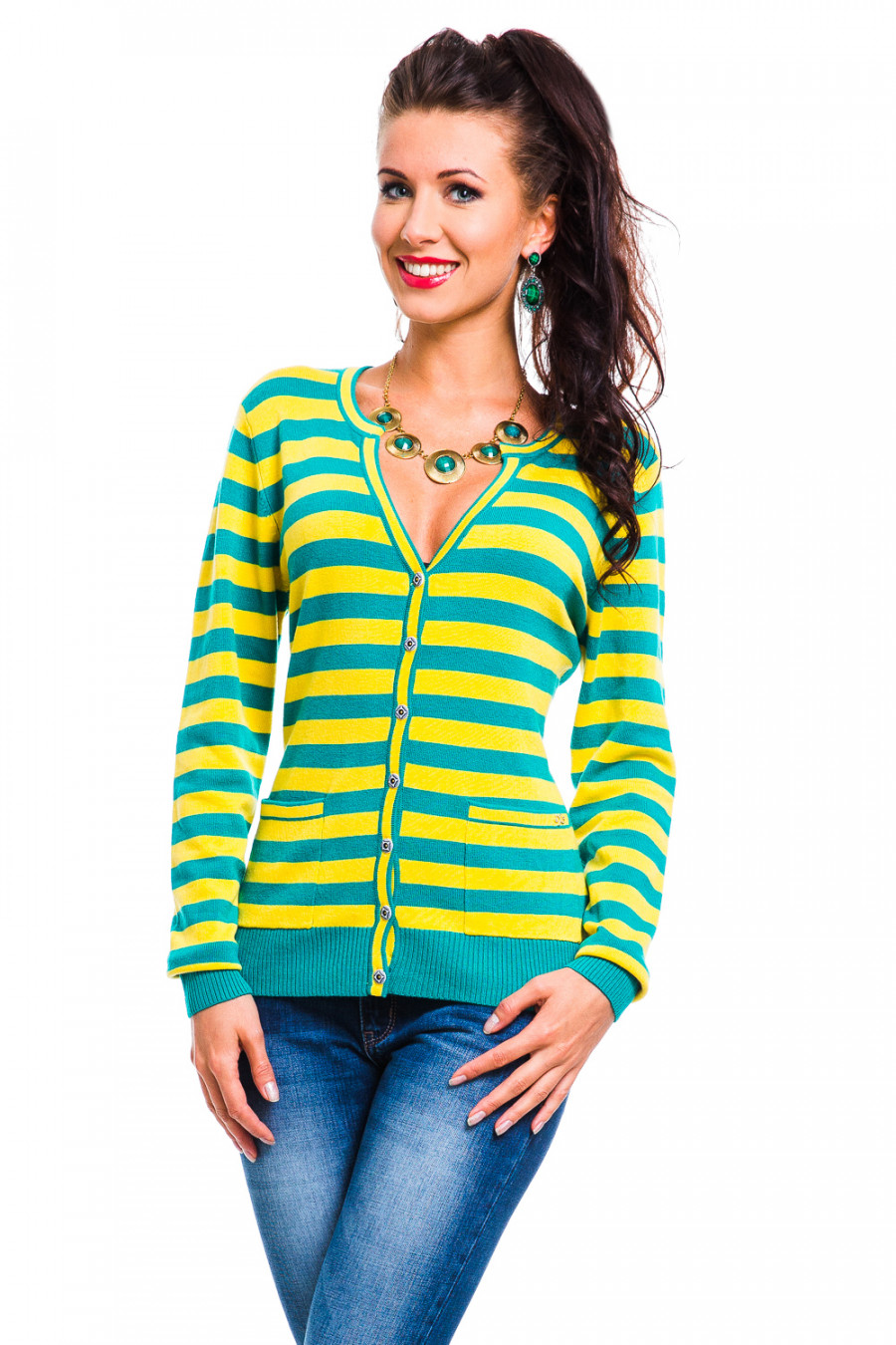 Соблазнительный жакет на пуговицых, в полоску, интеренсный глубокий вырез, выгодно подчеркнет привлекательные части Вашей фигуры.