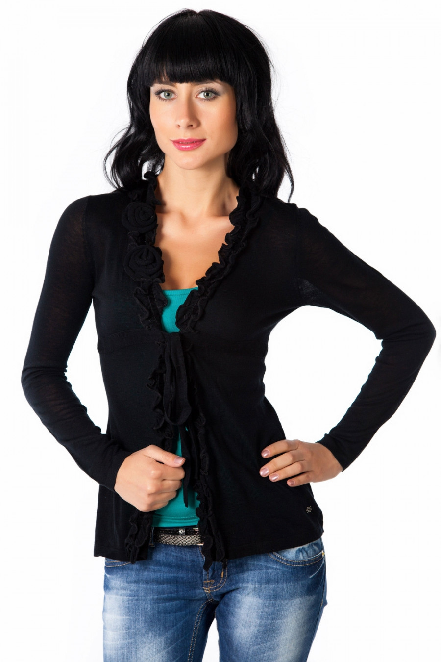 Оригинальный жакет приталенного кроя, модель с длинным рукавом на завязке. По краю ворота окантован изящной оборкой и украшен розочками. Нарядный вариант для создания образа.