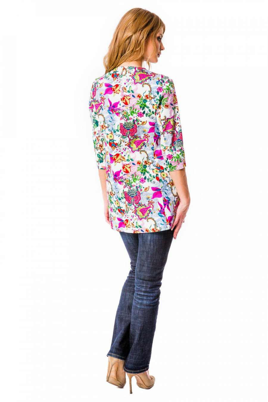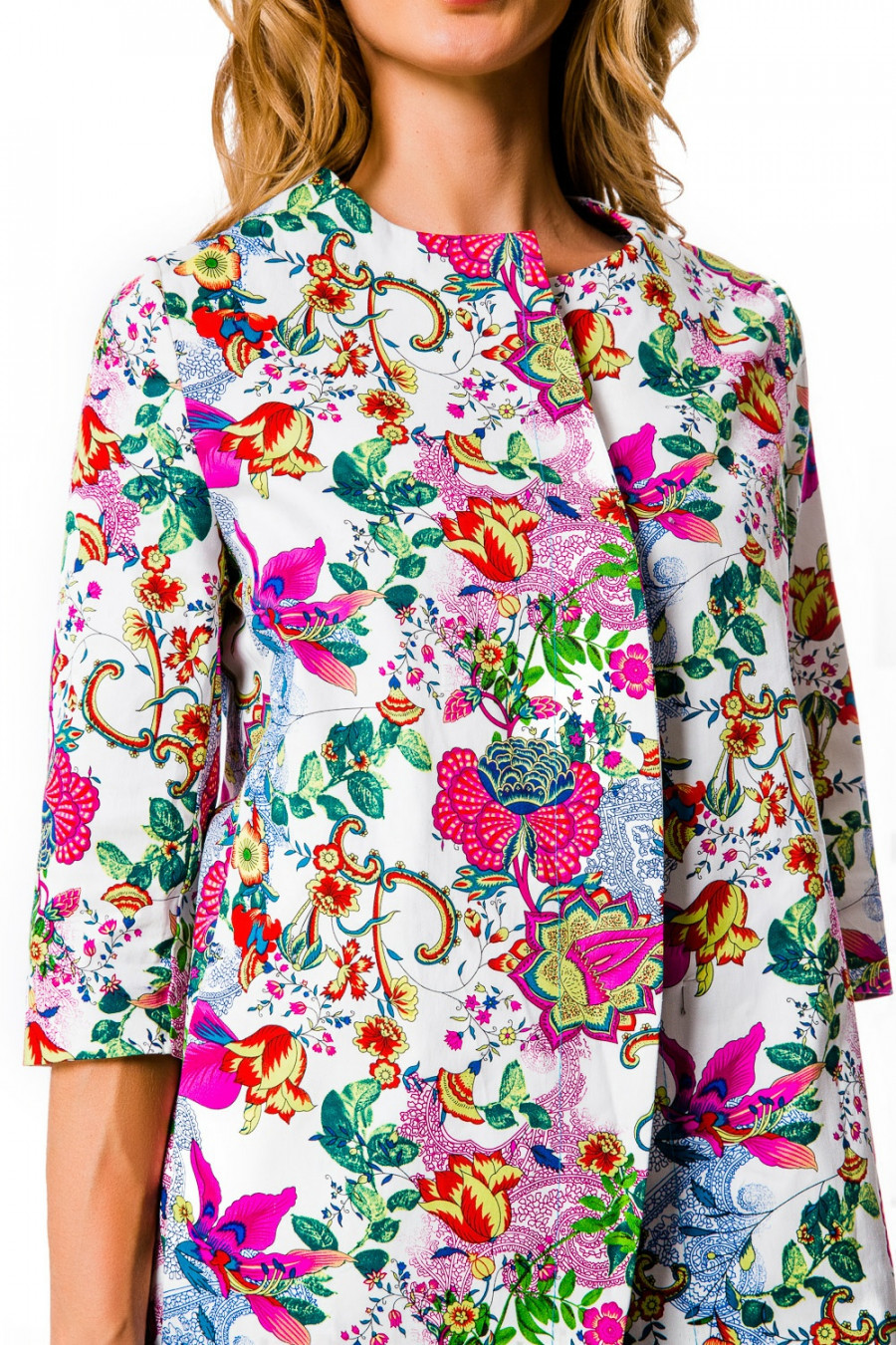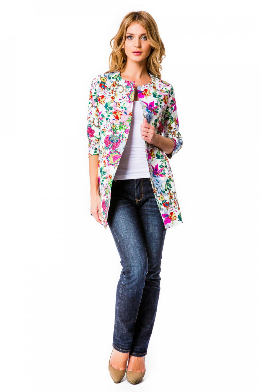 Стильный удлиненный пиджак из текстильной ткани. Модель свободного прямого кроя с округлым вырезом горловины, рукавами 3/4 и застежкой на пуговицы. Пиджак украшен ярким цветочным принтом. По бокам имеются карманы. Нарядный и модный вариант для завершения образа.