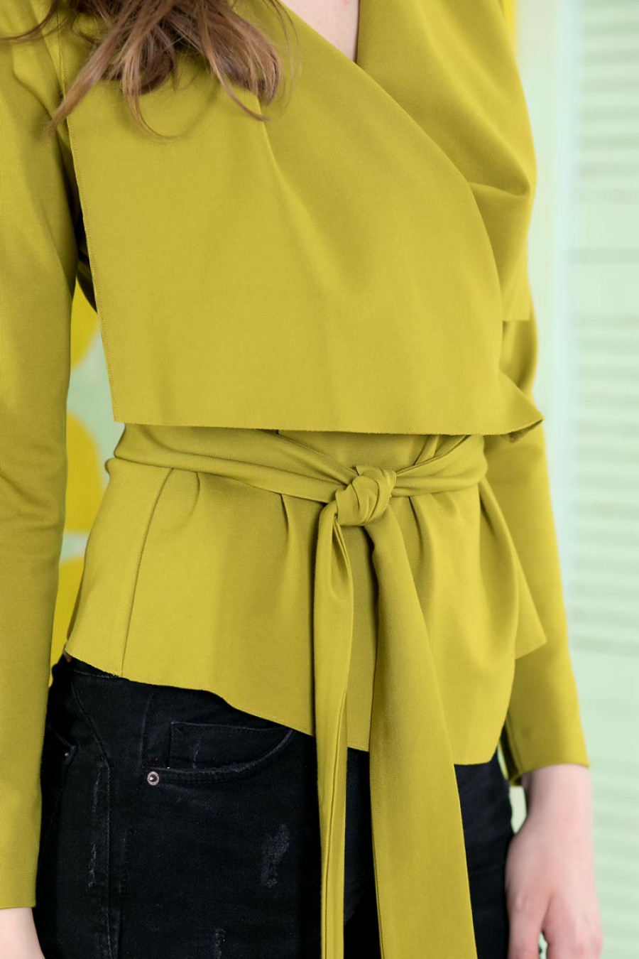 Очаровательный жакет свободного кроя с широким воротником-шаль и длинным рукавом. Внутри по талии застежка на кнопки. На талии завязывается пояс.