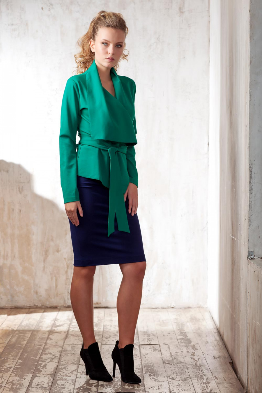 Очаровательный жакет свободного кроя с широким воротником-шаль и длинным рукавом. Внутри по талии застежка на кнопки. На талии завязывается пояс.