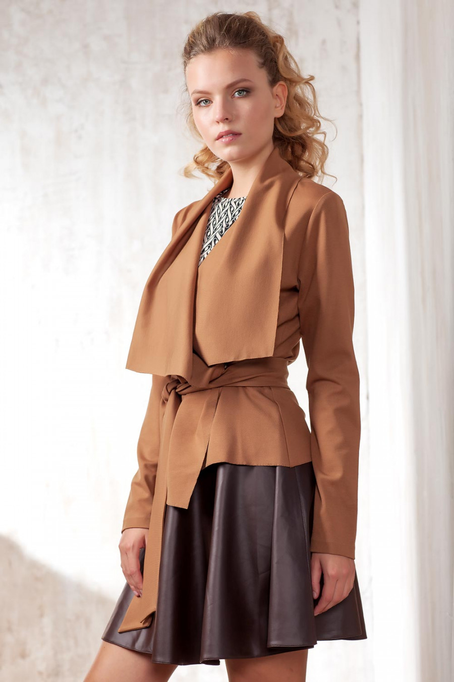 Очаровательный жакет свободного кроя с широким воротником-шаль и длинным рукавом. Внутри по талии застежка на кнопки. На талии завязывается пояс.