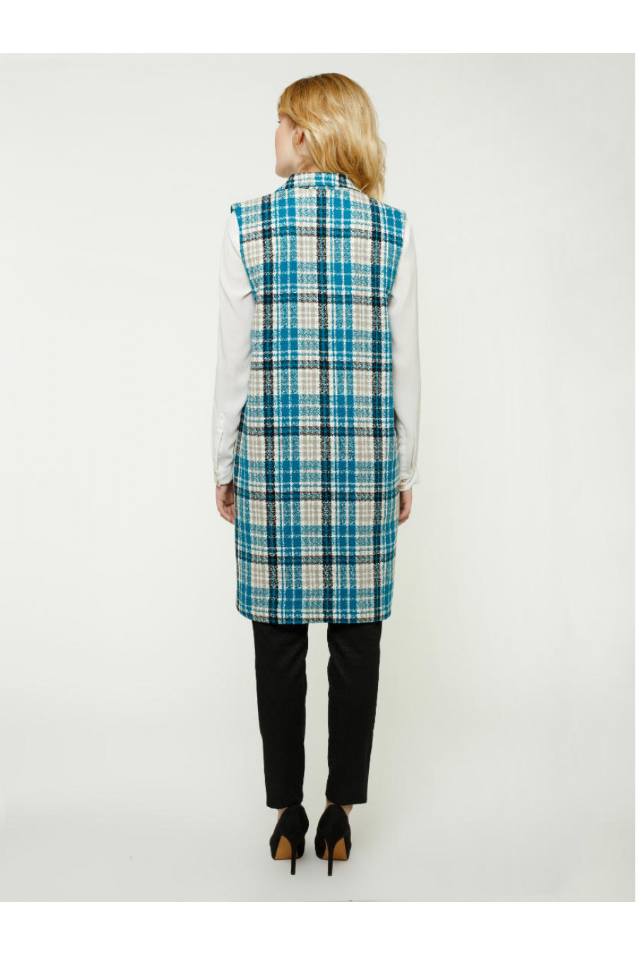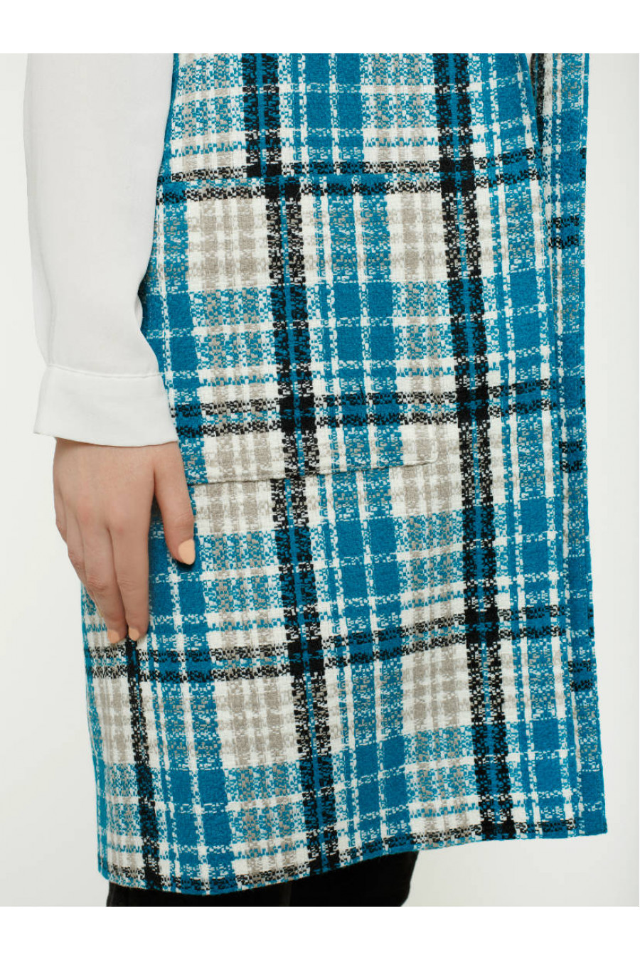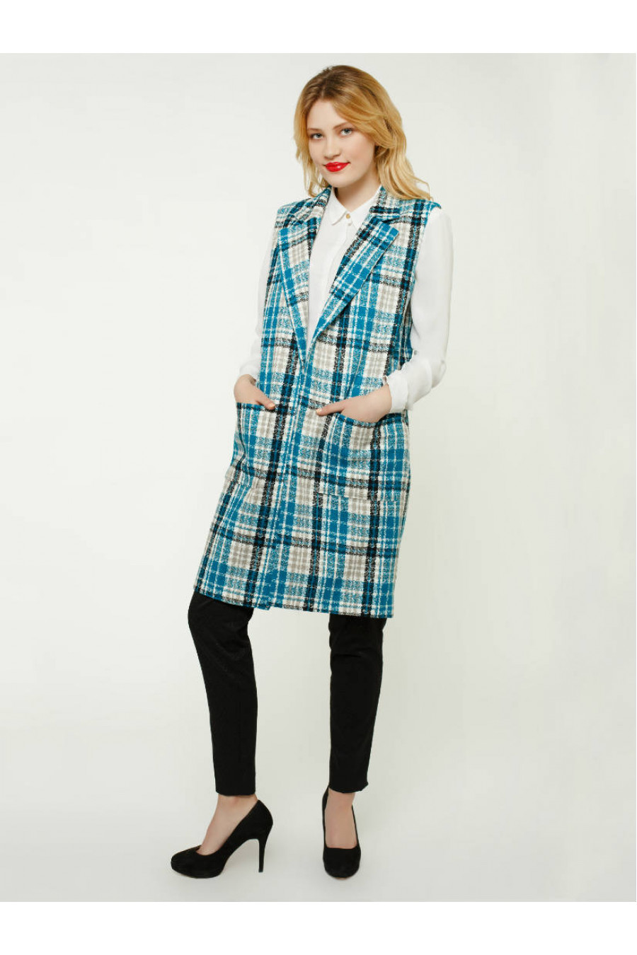 Легкий, теплый и комфортный клетчатый жакет голубого цвета. Накладные квадратные карманы. Жакет без пуговиц. Английский воротник. Такой жакет прекрасно сочетается с платьями футляр, повседневными или офисными.