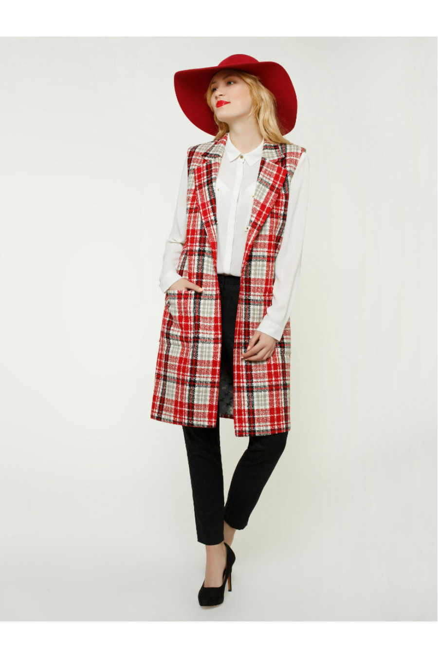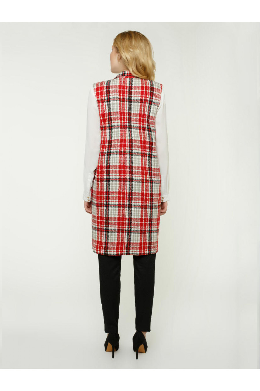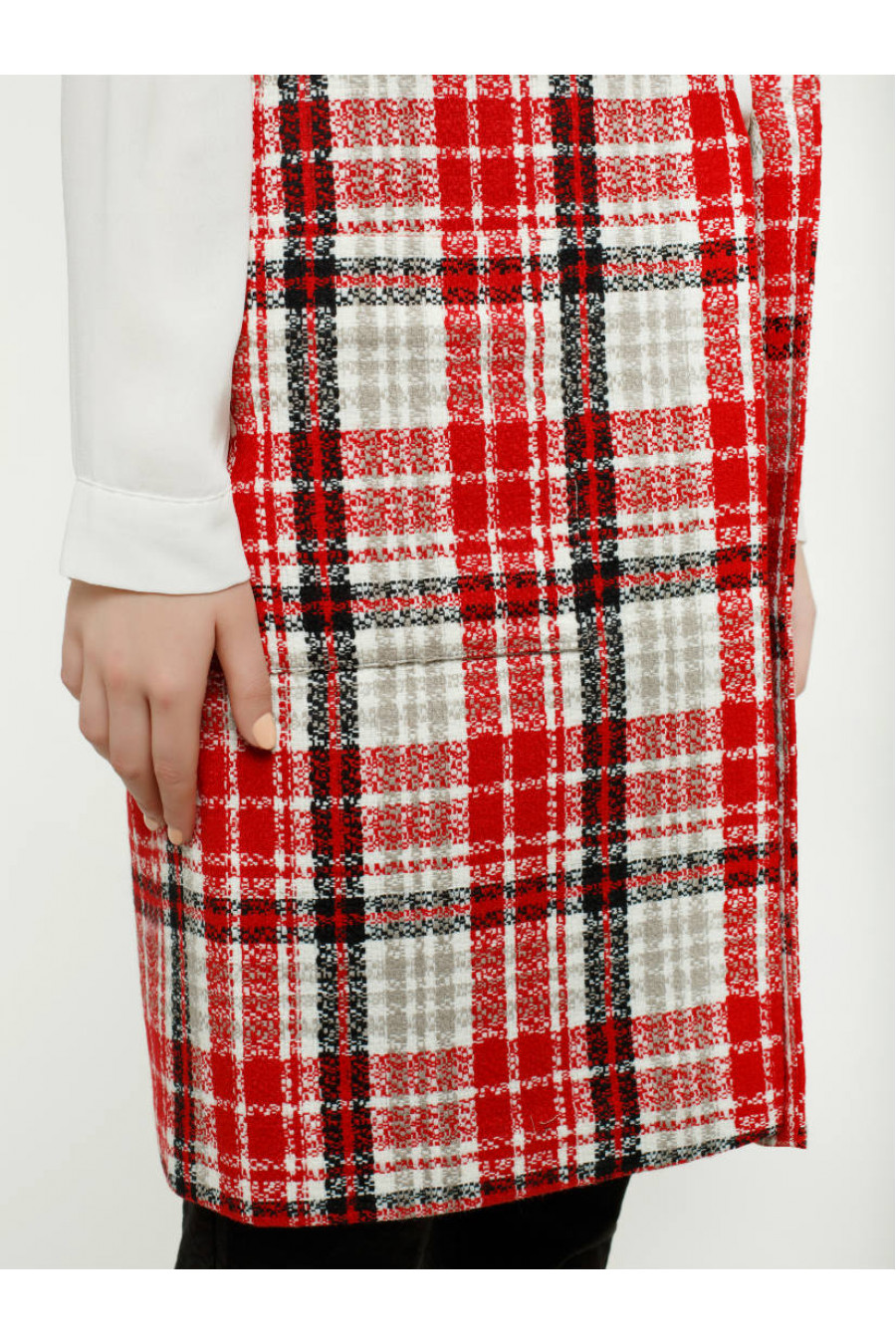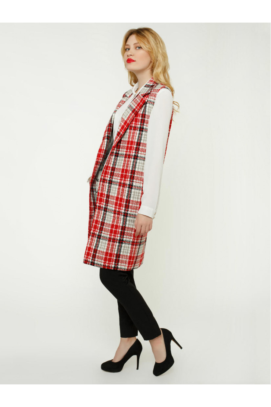 Легкий, теплый и комфортный красный клетчатый жакет. Накладные квадратные карманы. Жакет без пуговиц. Английский воротник. Такой жакет прекрасно сочетается с платьями футляр, повседневными или офисными.