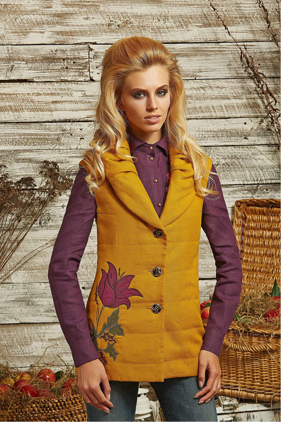 Эксклюзивный стёганый жилет выполнен из натурально льна. Жилет прямого силуэта с воротником-шалькой. Изделие на подкладке, по переду располагается аппликация с элементами вышивки. Красивая вышивка не только украшает изделие, но и придаёт образу неповторимый и изысканный стиль. Все модные дизайнеры, называют вышивку главным хитом этой осени.