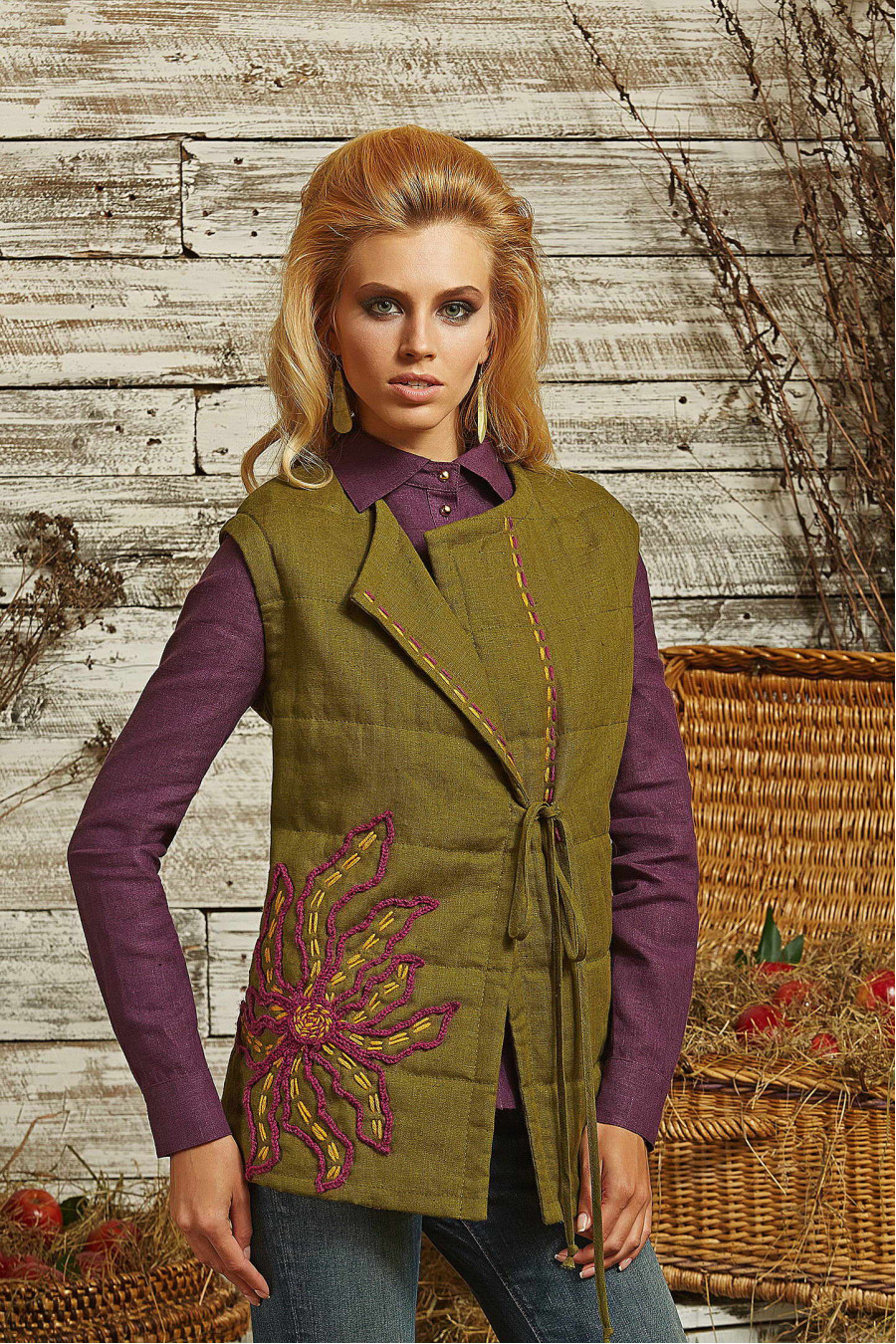 Оригинальный стёганый жилет выполнен из натурально льна. Жилет не имеет застёжки и завязывается по переду на льняную тесьму. Изделие декорировано необычным цветком ручной работы. Цветок связан крючком, а затем настрочен на готовое изделие. Изделие на подкладке.