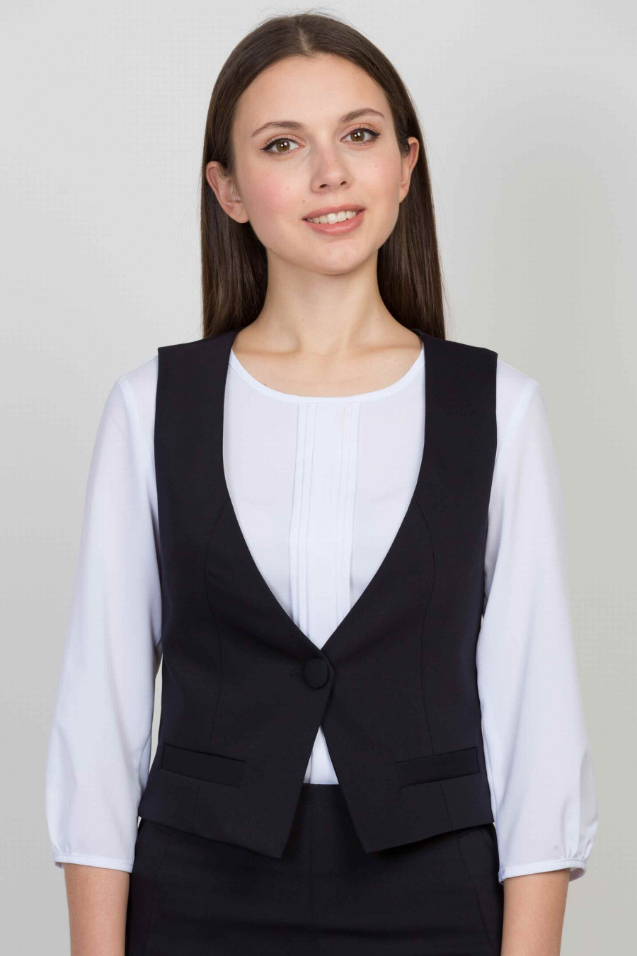 Стильный жилет с оригинальным вырезом горловины. Модель будет удачно гармонировать с различными элементами гардероба.Приталенный покрой выгодно подчеркивает фигуру..