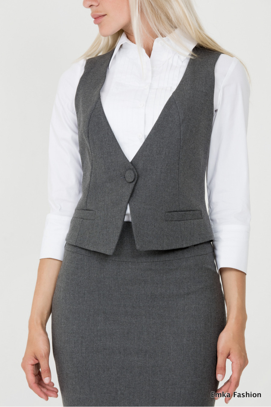 Стильный жилет с V-образным вырезом горловины. Модель будет удачно гармонировать с различными элементами гардероба.Приталенный покрой выгодно подчеркивает фигуру.