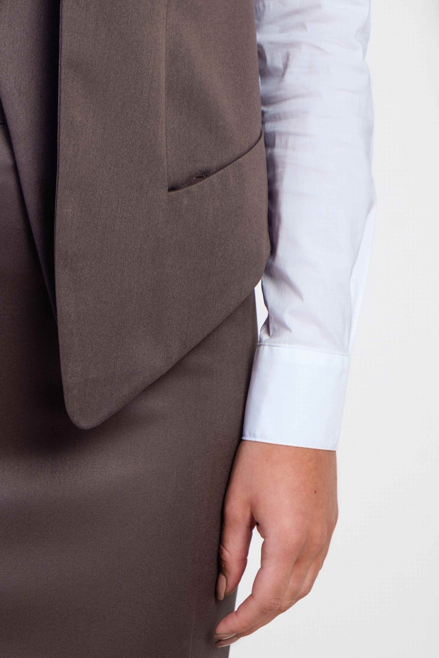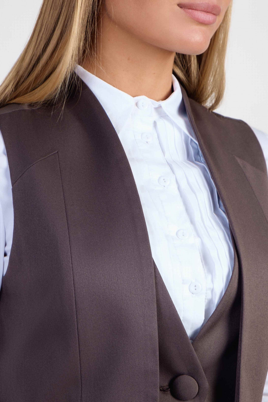 Элегантный жилет в классическом стиле с оригинальным кроем. Ткань средней плотности, приятного цвета какао. Спереди оформлена внутренней фигурной планкой на пуговице, обшитой тканью в тон модели, и украшена неглубокими декоративными кармашками. Спинка укороченная, есть легкая подкладка из полиэстера. Идеально подойдет для офиса и создания строгого делового образа.