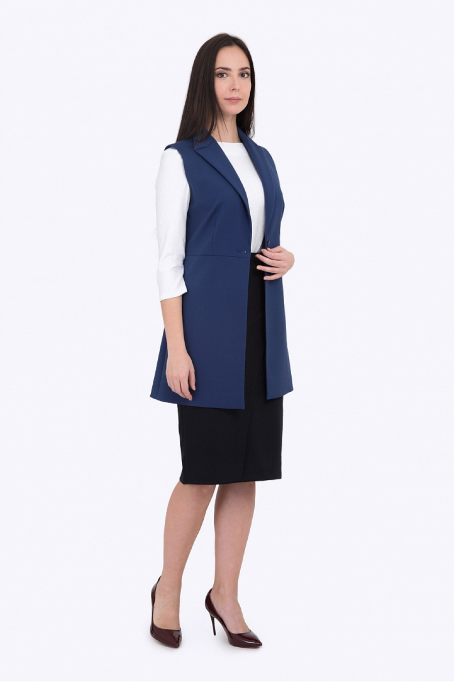 Стильный удлиненный жилет с классическим воротником. Ткань костюмная, гладкая, очень приятная на ощупь. Жилет приталенный застегивается на пуговицу в тон. Есть подкладка из атласа. Хорошо сочетается с классическими вещами, поможет создать идеальный образ для офиса.