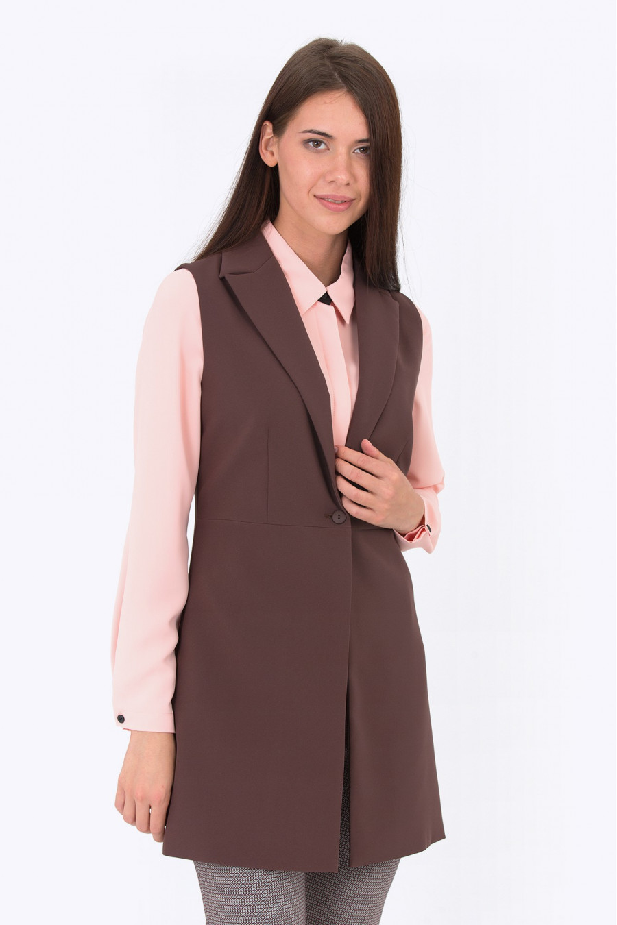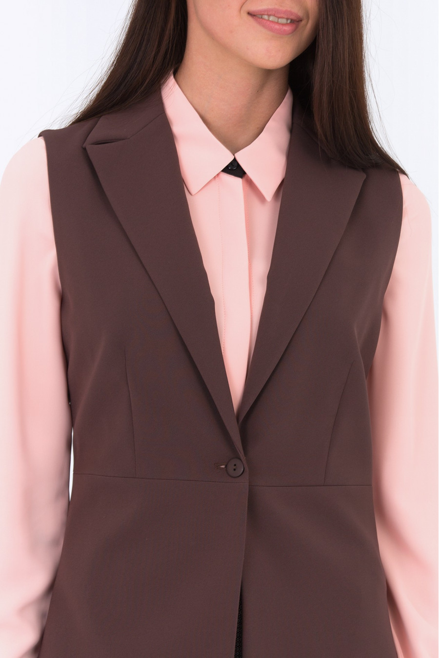 Элегантный удлиненный жилет с откидным воротничком. Приталенный сверху, расклешенный от линии бедер.
