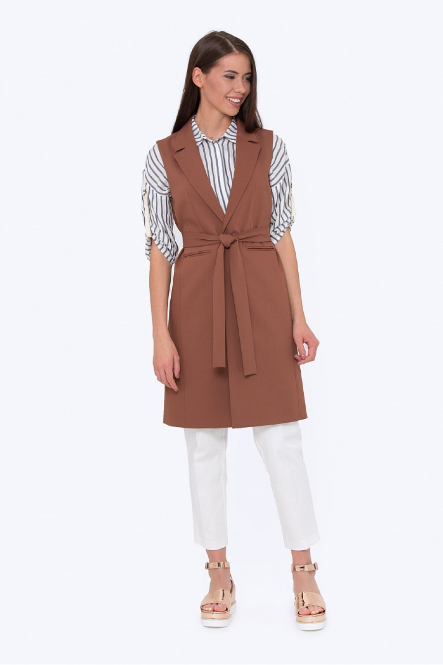 Удлиненный жилет с поясом. Ткань плотная структурная. Есть подкладка из полиэстера. Универсальная модель для создания стильного офисного лука или ультрамодного образа в стиле Casual.