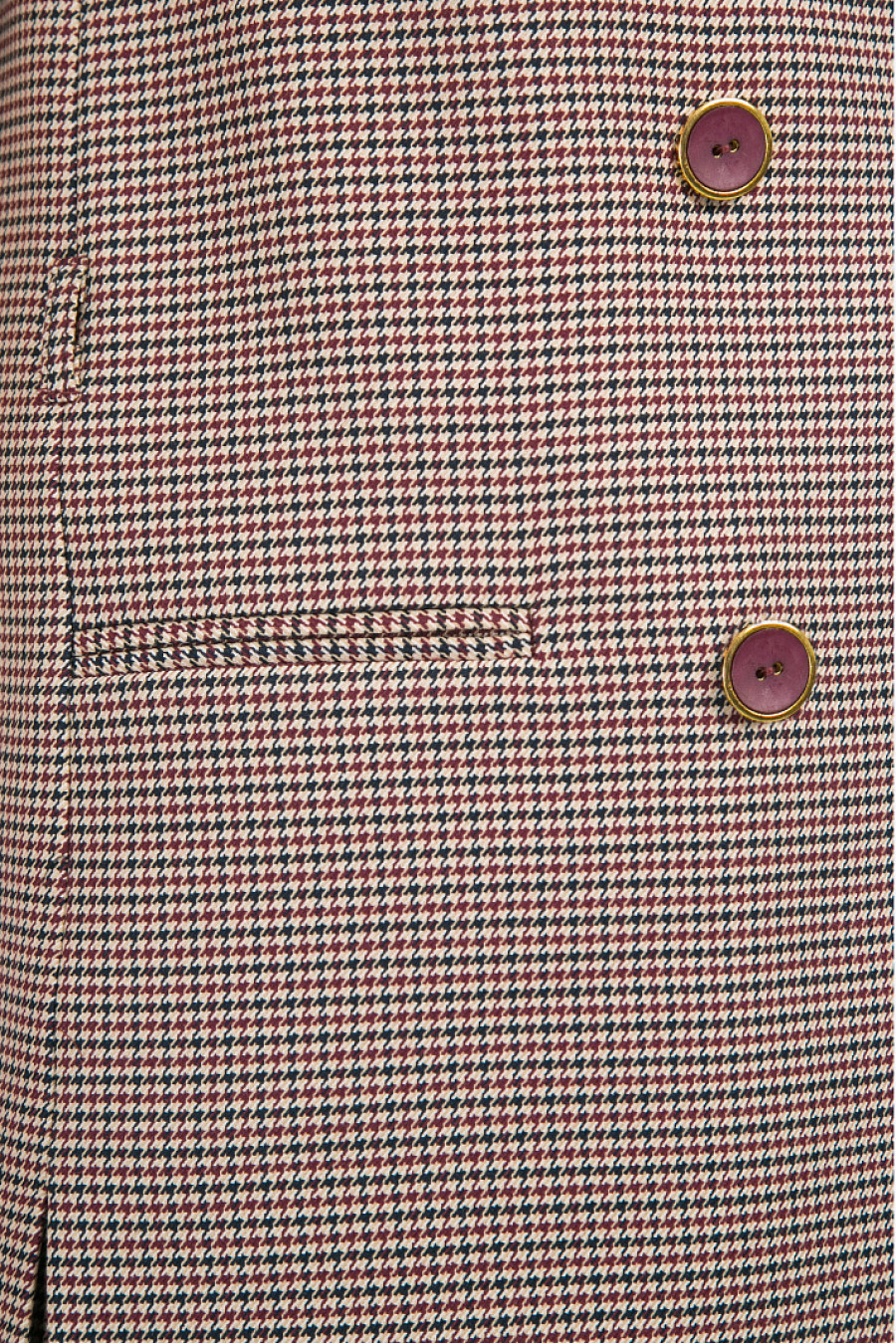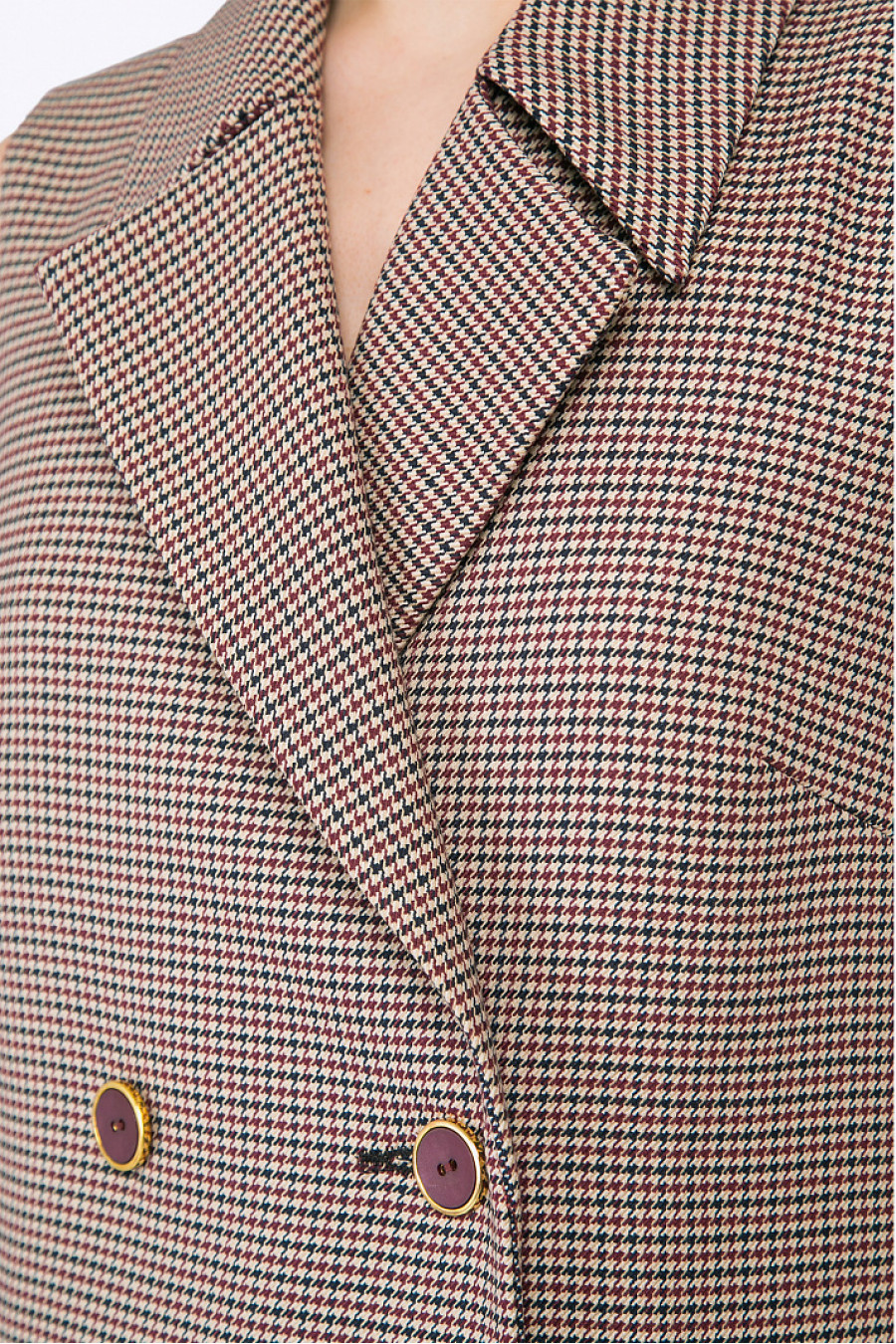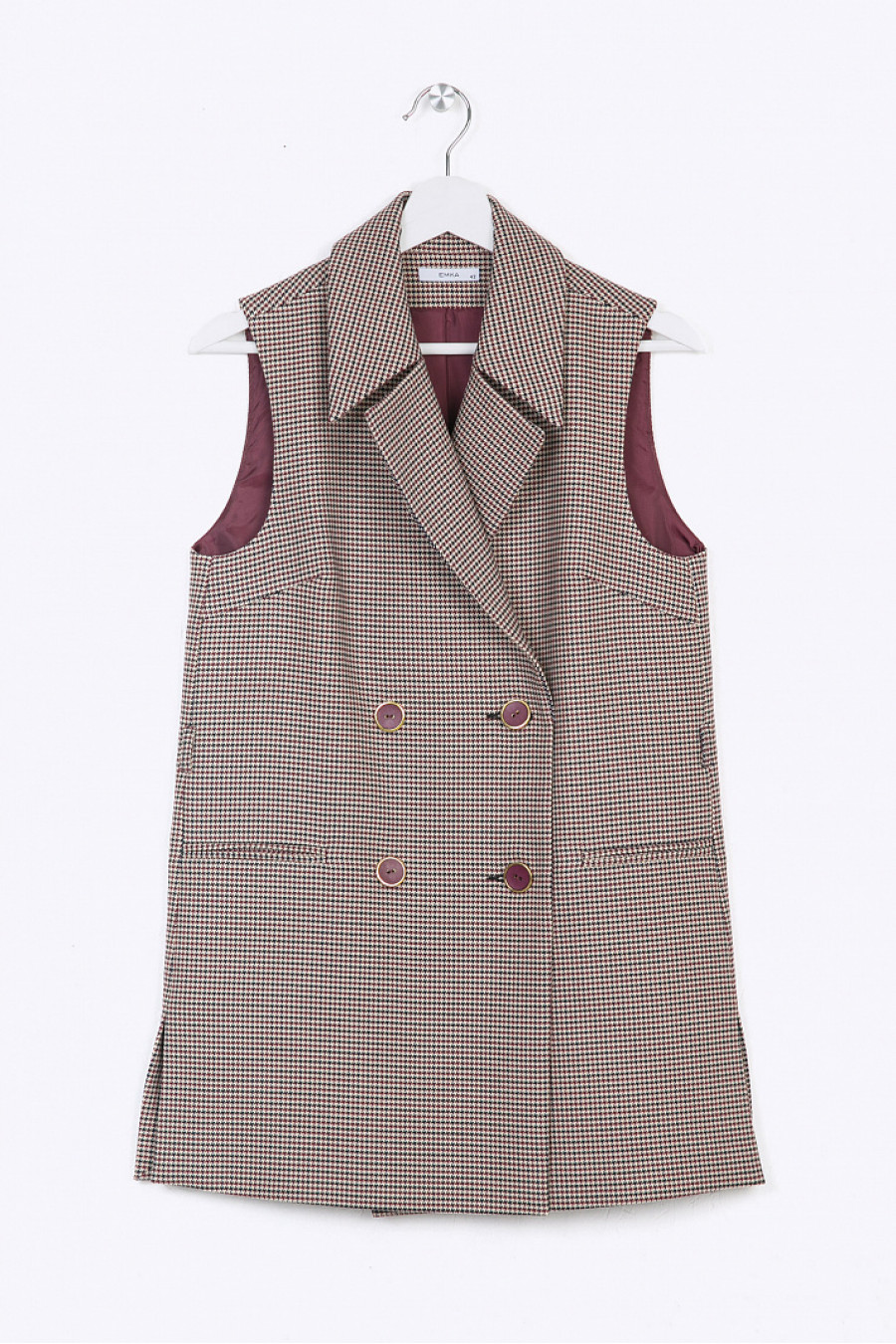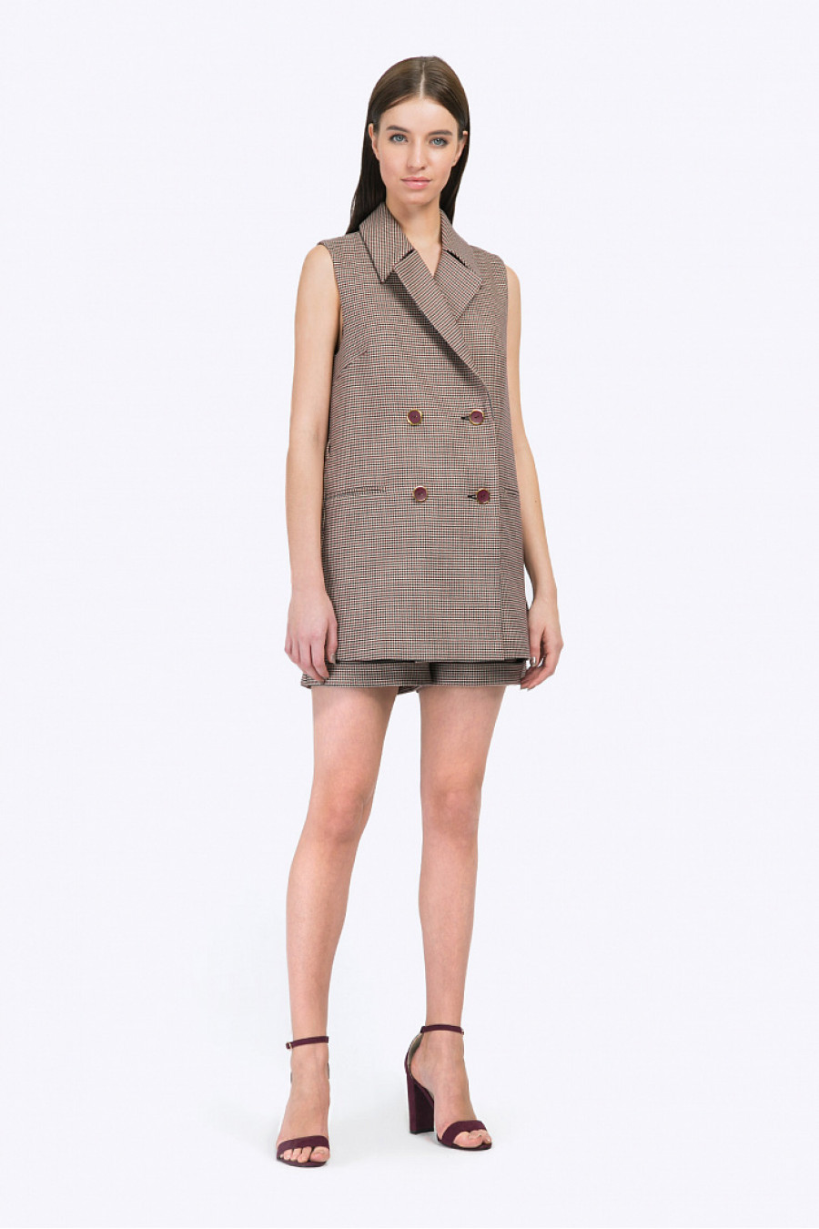 Прикрывающий бёдра строгий двубортный жилет с отложным воротником. Модель выполнена из костюмной ткани с классическим орнаментом «пье-де-пуль» в бордовых, синих и бежевых оттенках. Декорирована врезными карманами, небольшими разрезами по бокам и шлёвками для узкого ремешка. Разбавить строгий образ позволят шорты P001-abuela, в комплекте с которыми возможно составить современный тотал-лук. Рост фотомодели 175 см. Образ на фото дополнен брюками P001-abuela .
