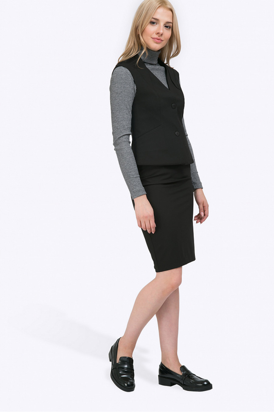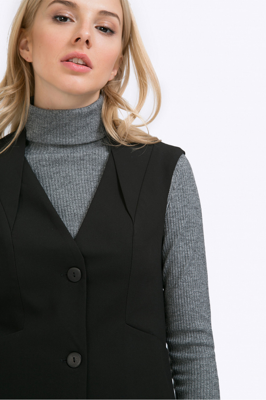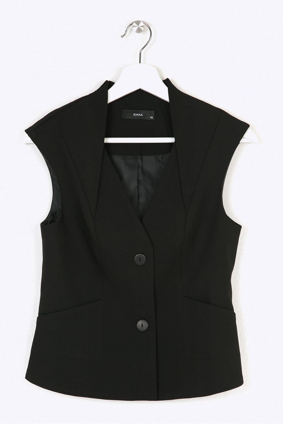 Чёрный однобортный жилет полуприталенного силуэта на подкладке.