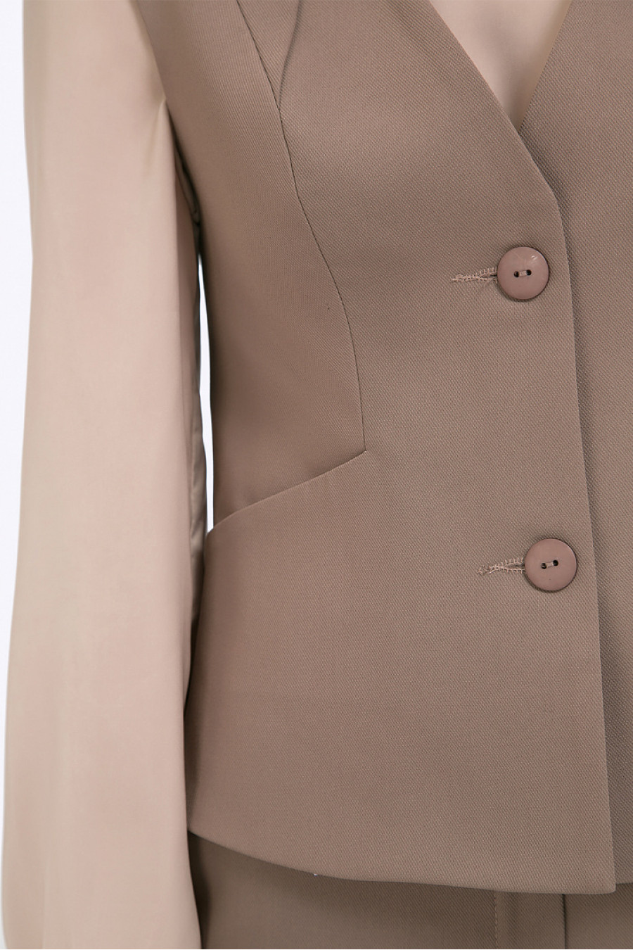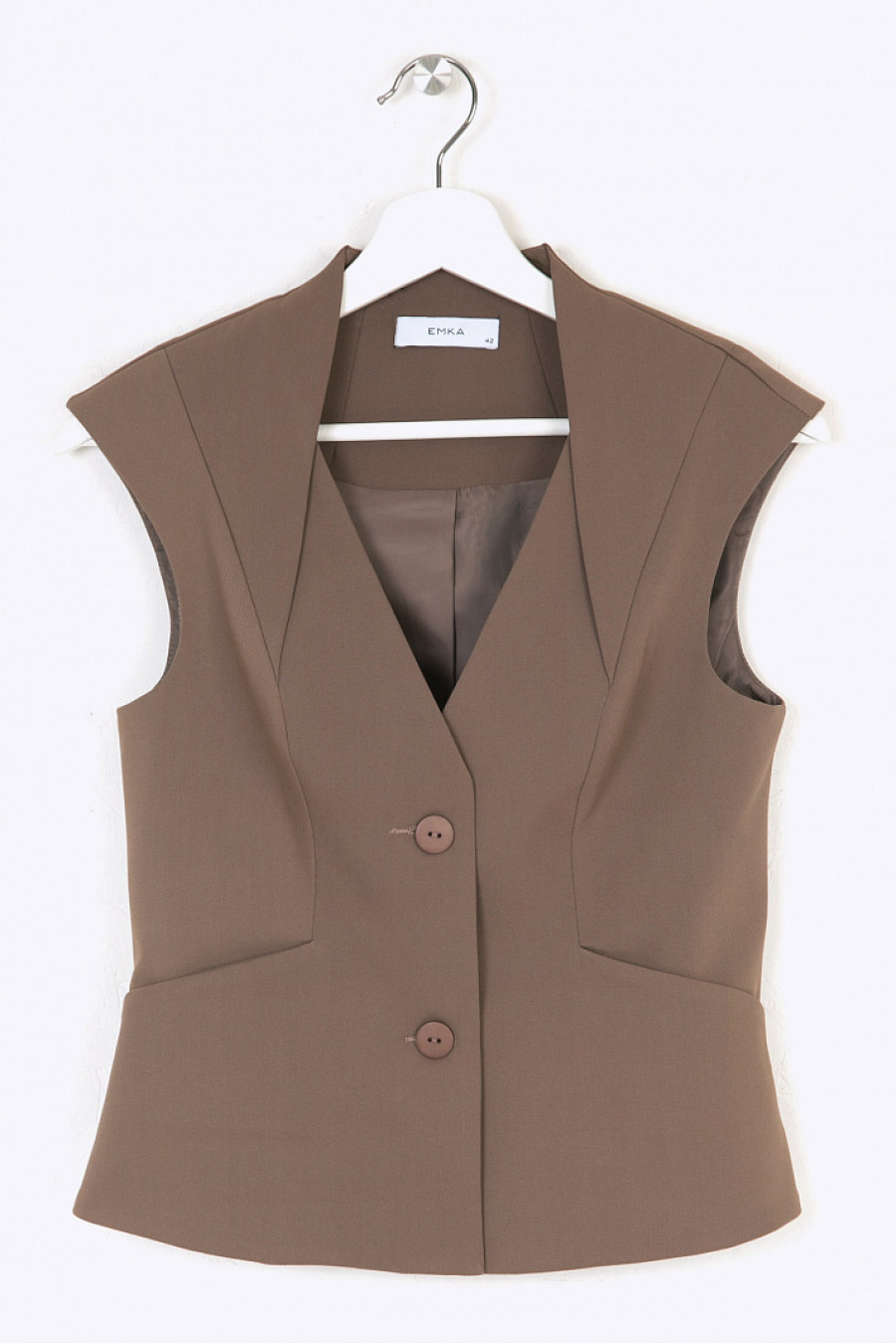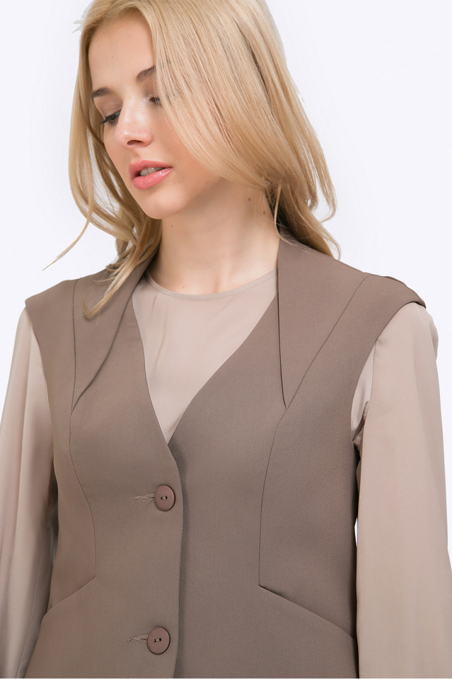 Однобортный полуприталенный жилет цвета мокко. Выполнен на подкладке.