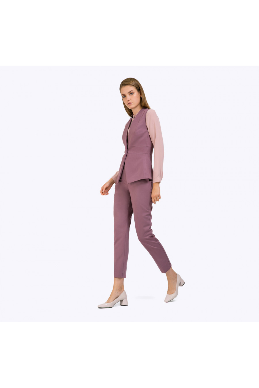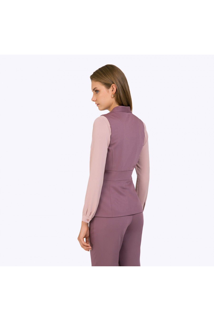 Однобортный лиловый жилет на подкладке. Модельотрезная по линии талии, с широкой вставкой, имитирующей пояс. Выполненабез ворота,с вертикальными вытачками из плечевых швов, призастёгиваниина пуговицуобразуется женственный прилегающий силуэт. Рост фотомодели 177 см. Образ на фото дополнен брюками D115-rovonda