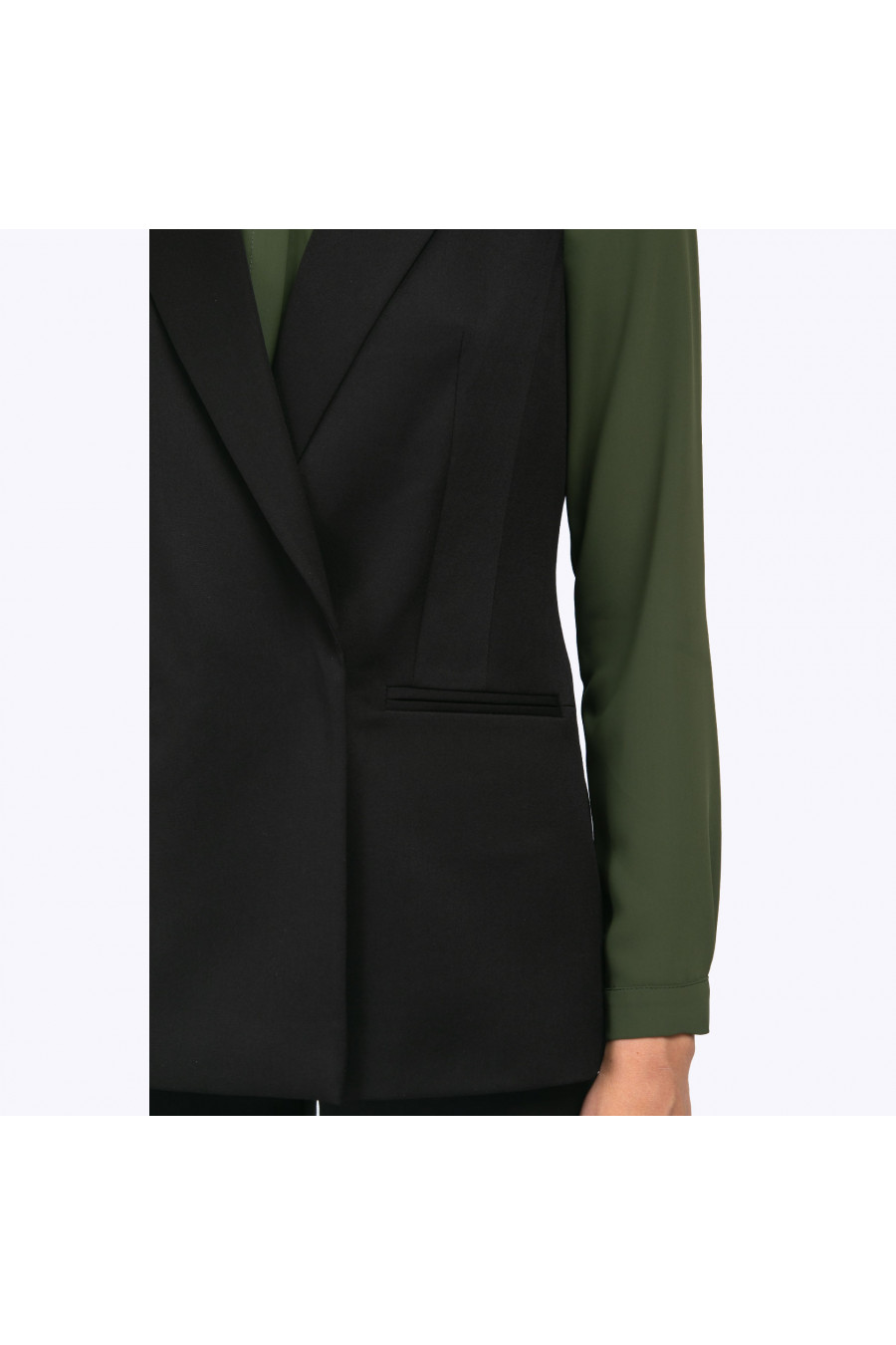 полуприталенного силуэта, прикрывает бёдра, имеет классический английский воротник с лацканами,