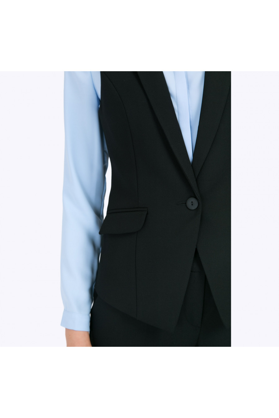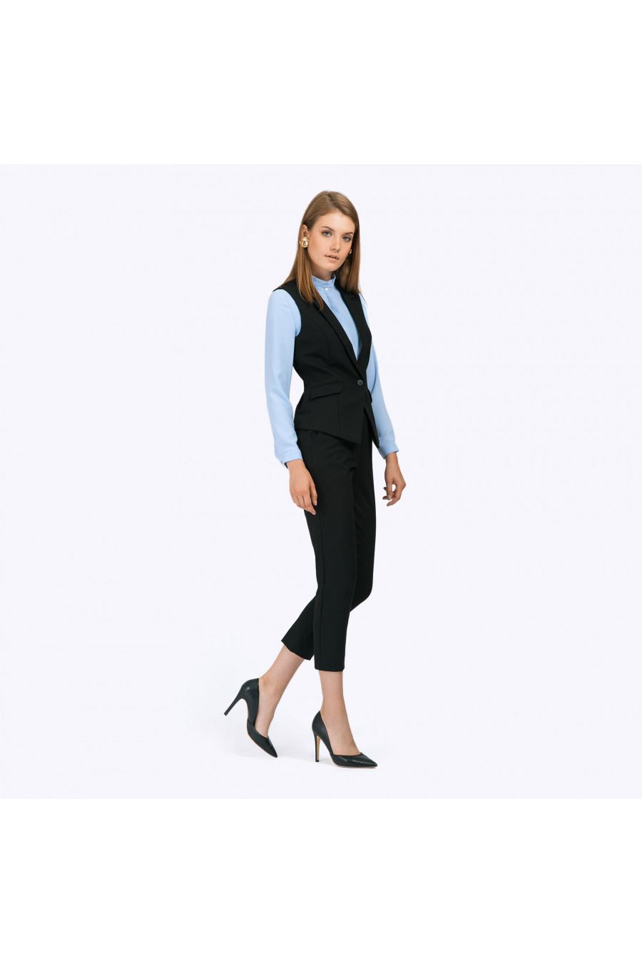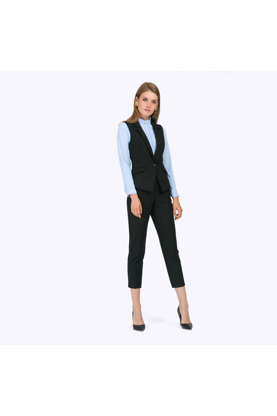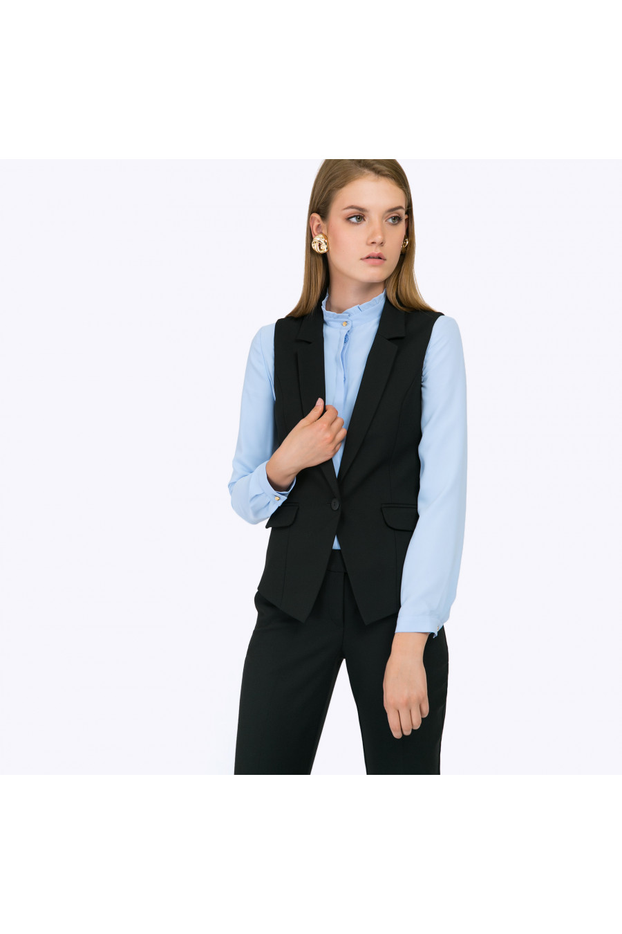 Классический черный жилет с накладными карманами и отложным воротником станет выразительным дополнением к традиционному деловому образу, а также придаст элегантности в повседневный стиль. Образ на фото дополнен брюками D011-almaza