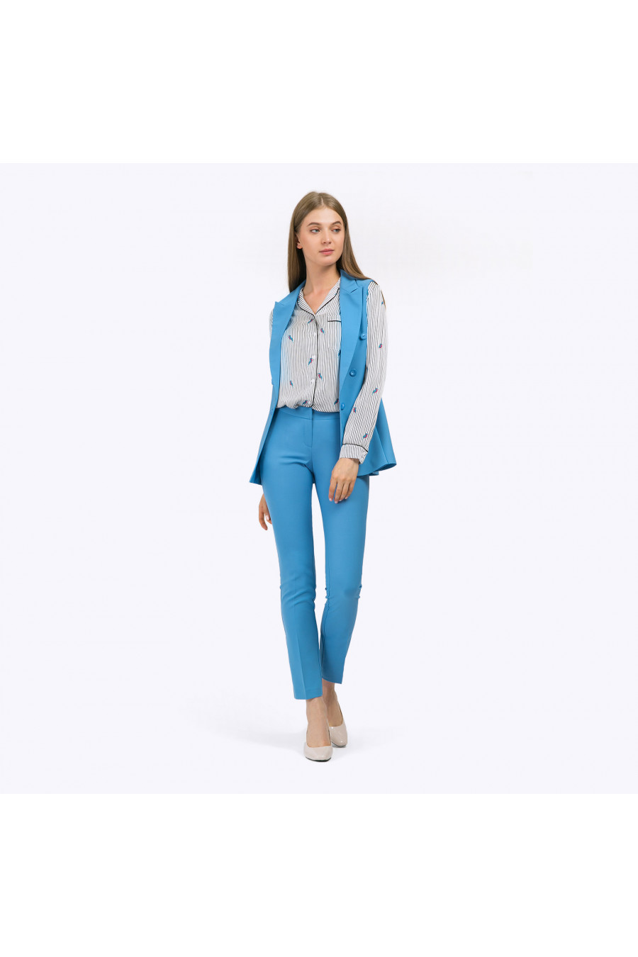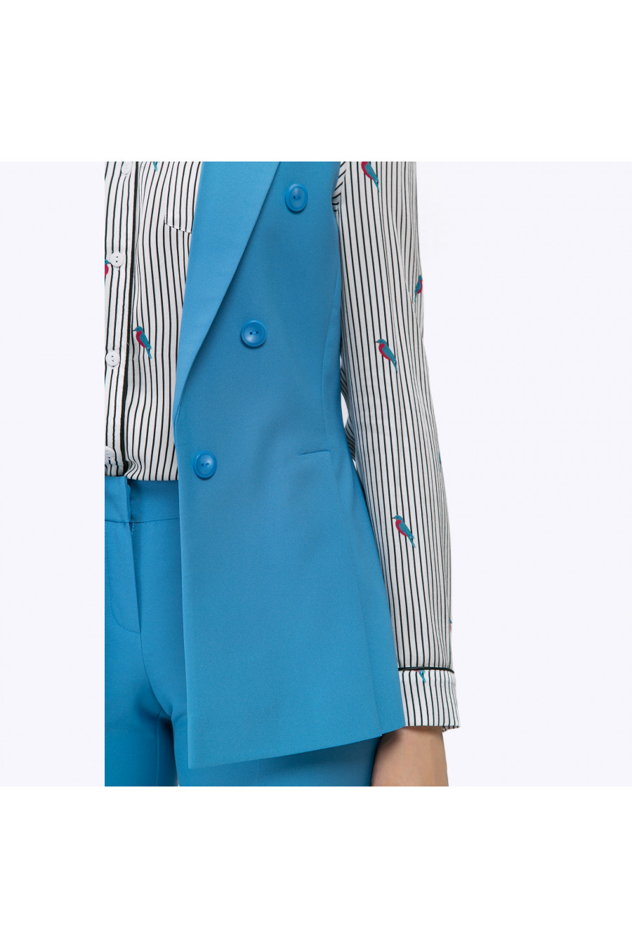 Голубой жилет полуприлегающего силуэта с двумя рядами пуговиц. Выполнен из практичного в носке смесового костюмного полотна. Модель имеет лаконичные плавные линии, дополненные классическим английским воротником и высокими разрезами в боковых швах. Образ на фото дополнен брюками D051-element