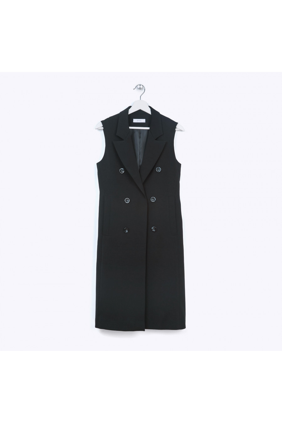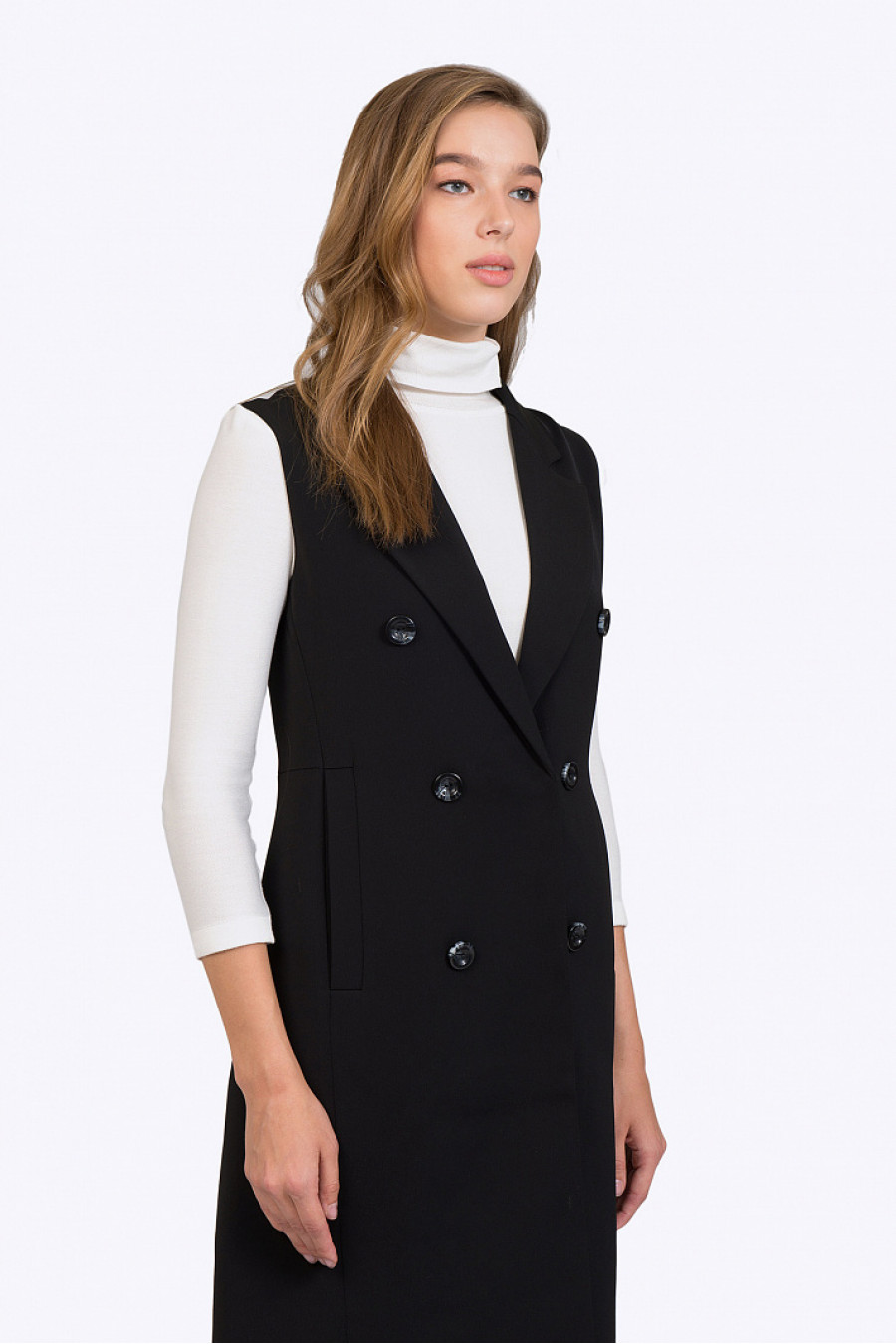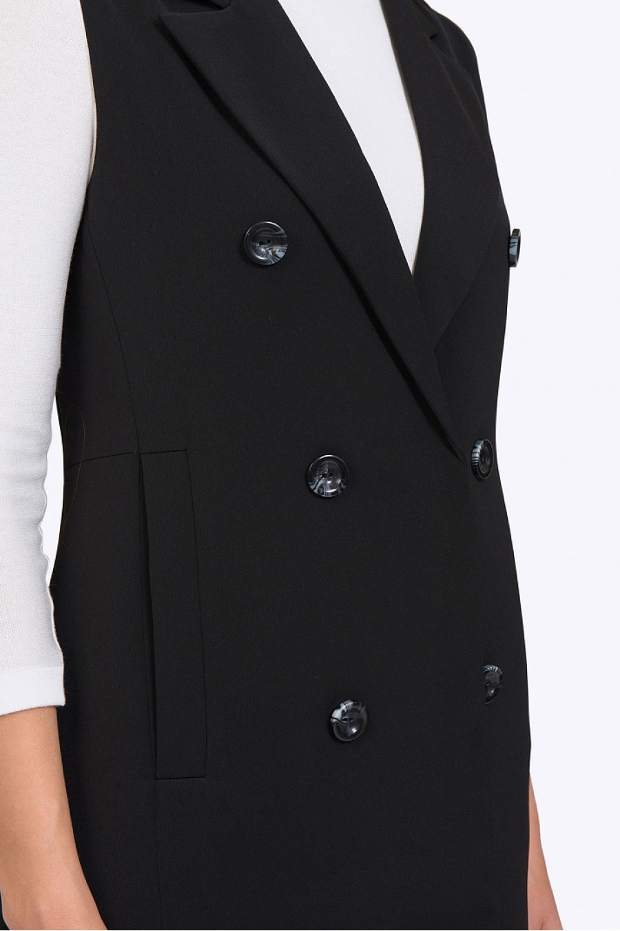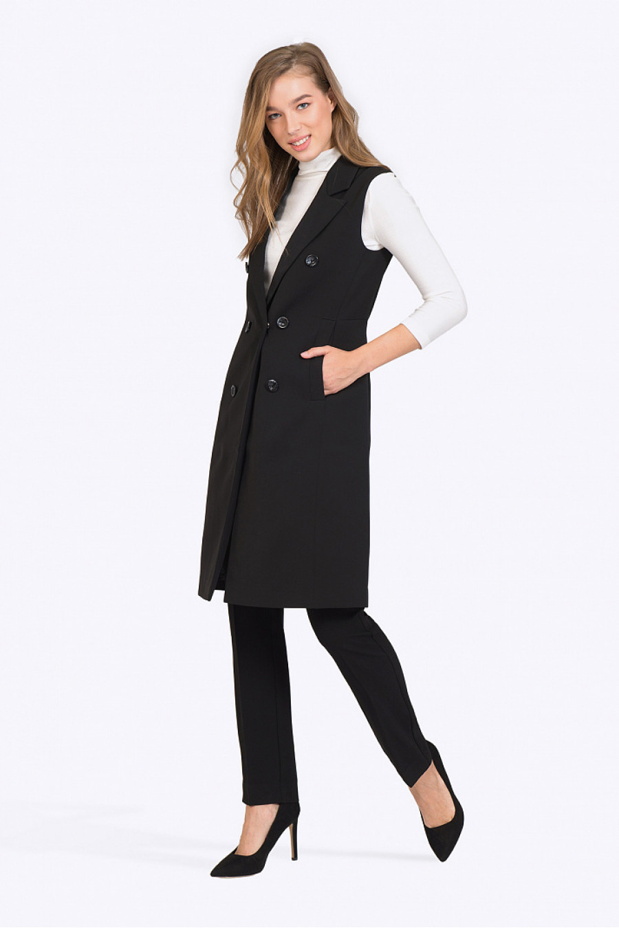 Длинный двубортный жилет чёрного цвета с закрытой застёжкой.Модель на подкладке. С классическим английским воротом и глубоким V-образным декольте. Передние полочки имеют прямой крой, декорированы тремя рядамидиагонально расположенных пуговиц и вертикальными карманами с листочкой. Отрезнаяпо лини талии спинка имеет полуприталенный силуэт, наружные вытачки в качестведекора и высокую шлицу. Образ на фото дополнен брюками D086-banksy