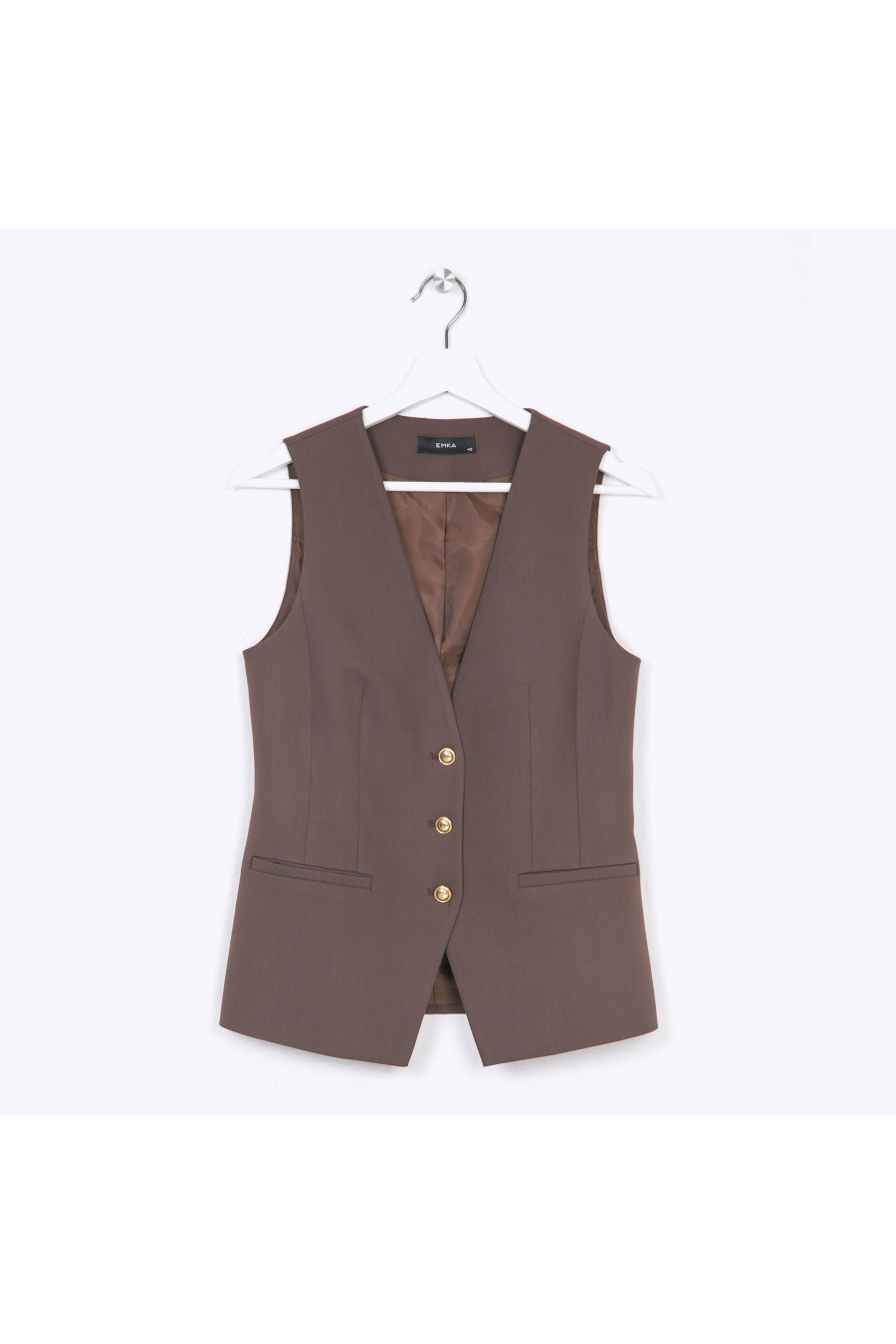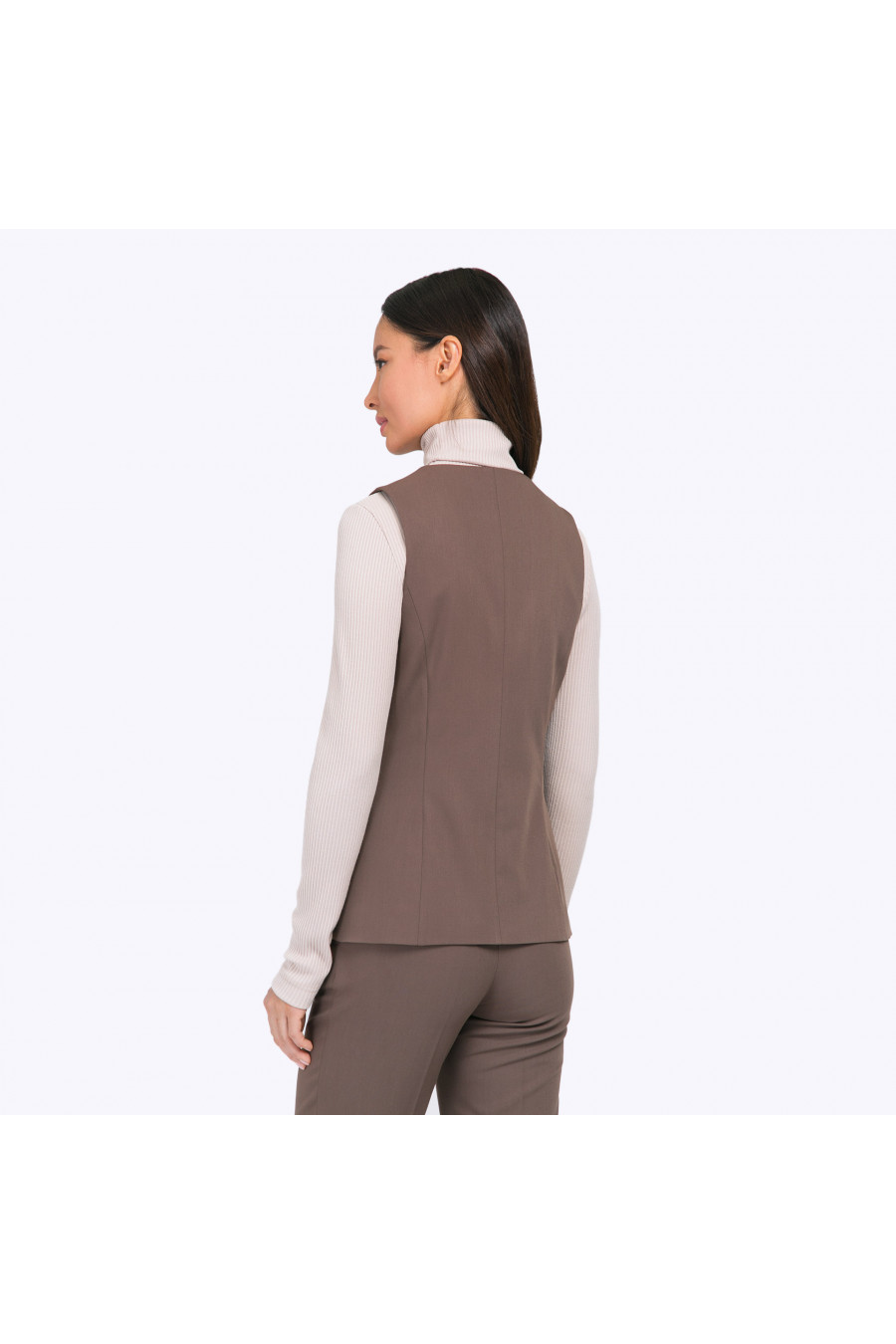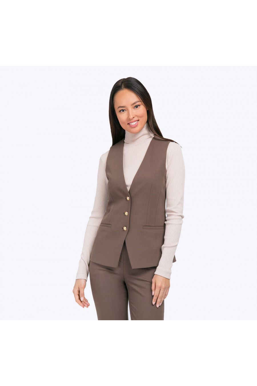 Строгий однобортный жилет цвета какао. Модель на подкладке, имеет полуприталенный силуэт за счёт вертикальных выточек спереди и рельефов на спинке.Полочки с центральной бортовой застёжкой соединены тремя металлическими пуговицами. Функциональным дополнением служат карманы с листочкой. Образ на фото дополнен блузкой B2285-paldim