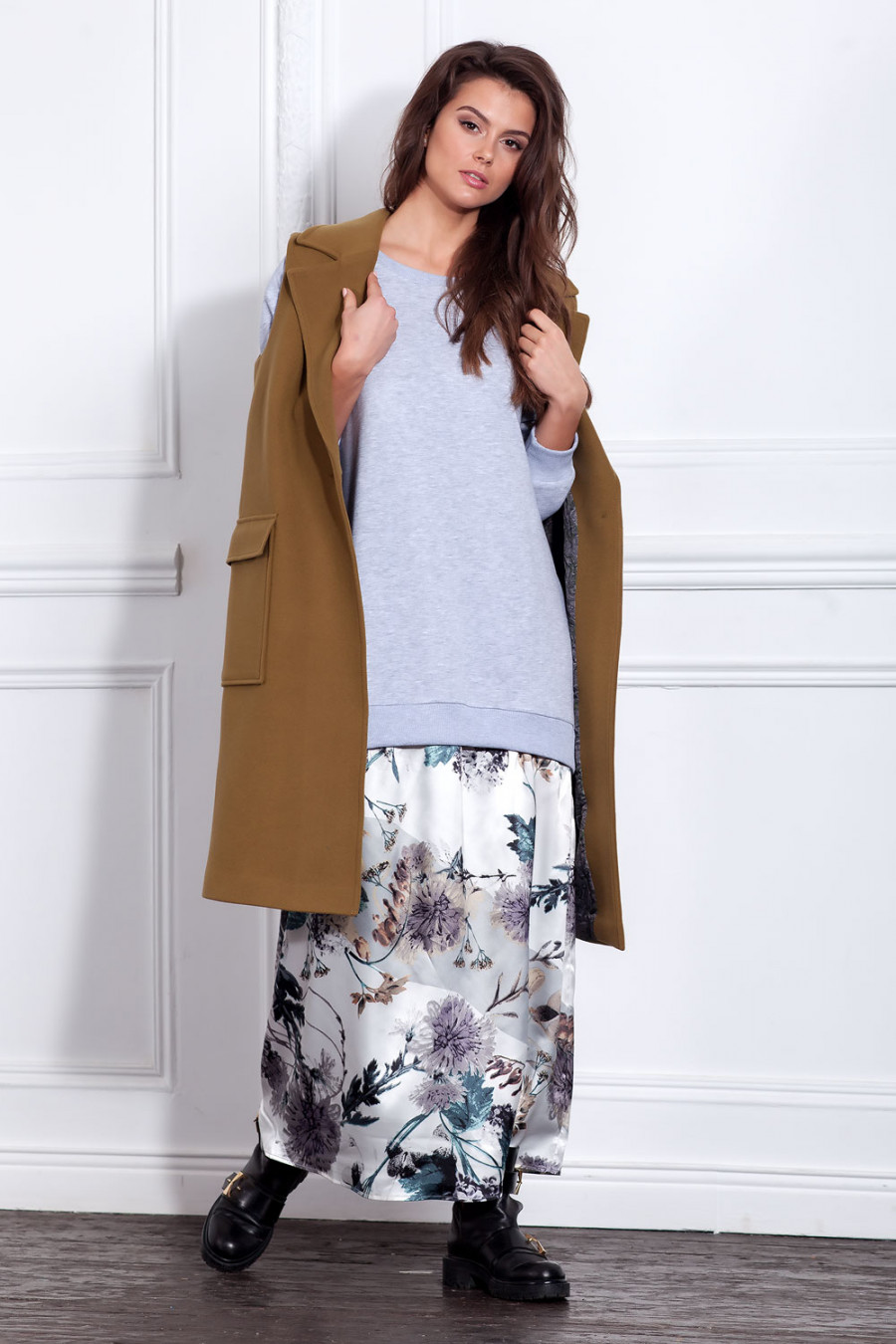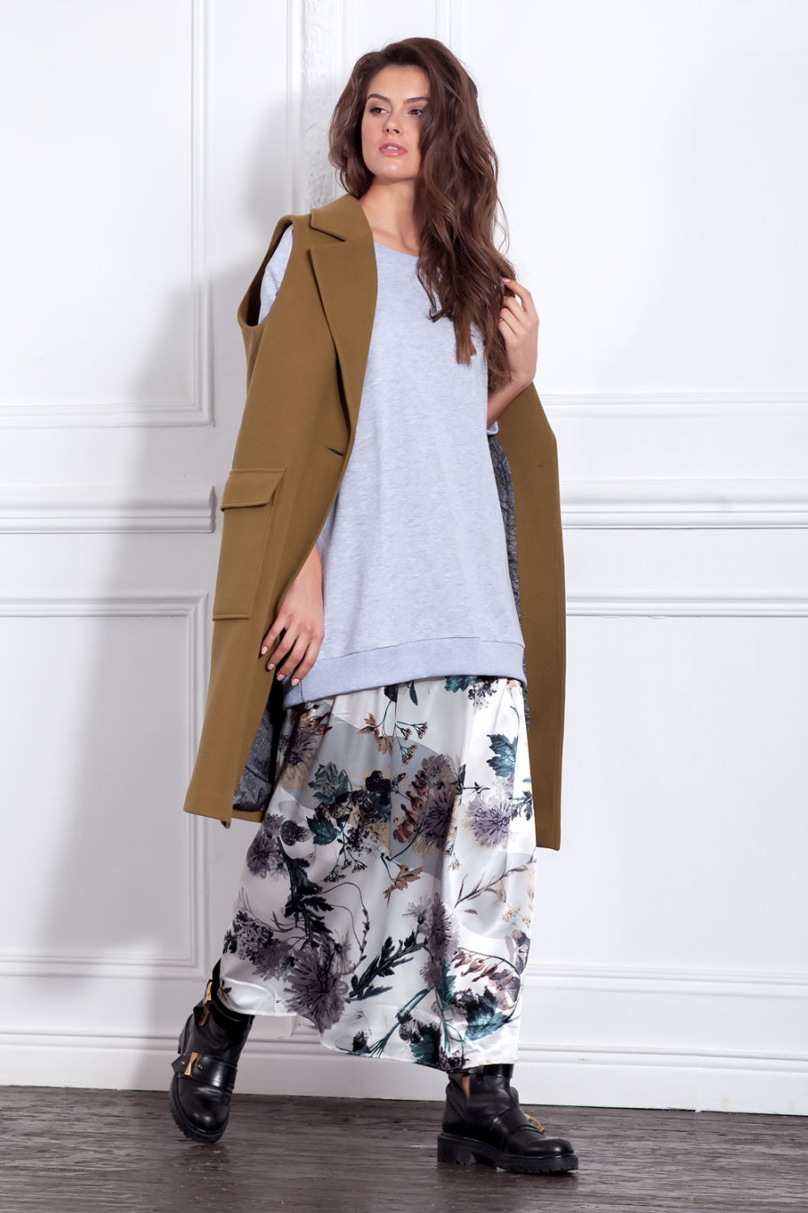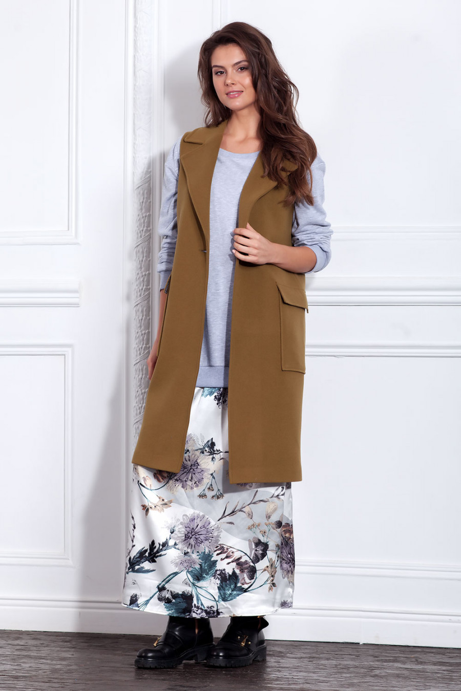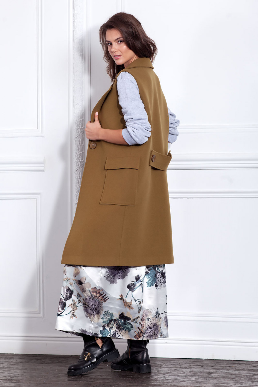 Стильный жилет из пальтовой ткани на подкладке. Модель объемная прямого силуэта с классическим воротником с лацканами и крупными накладными карманами по бокам. На спинке на уровне талии выполнен хлястик, закрепленный пуговицами. Застежка впереди на одну к...