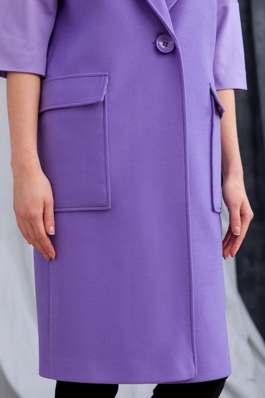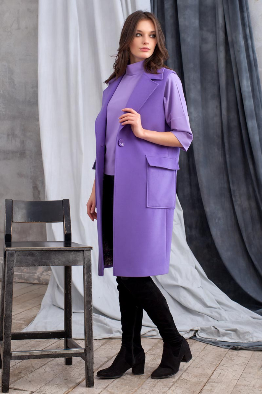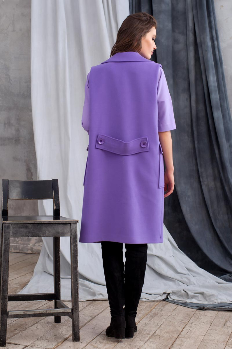 Стильный жилет из пальтовой ткани на подкладке. Модель объемная прямого силуэта с классическим воротником с лацканами и крупными накладными карманами по бокам. На спинке на уровне талии выполнен хлястик, закрепленный пуговицами. Застежка впереди на одну к...