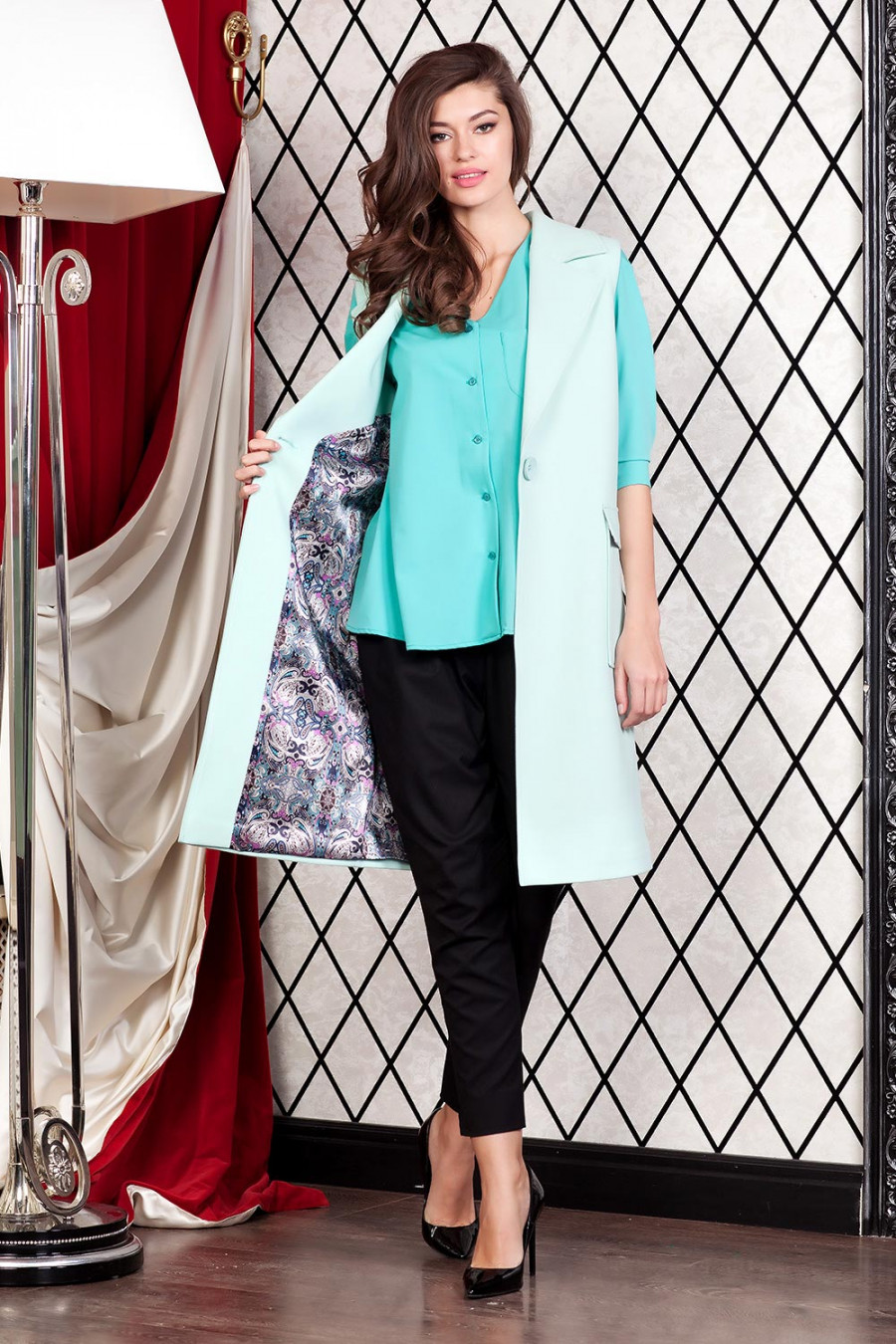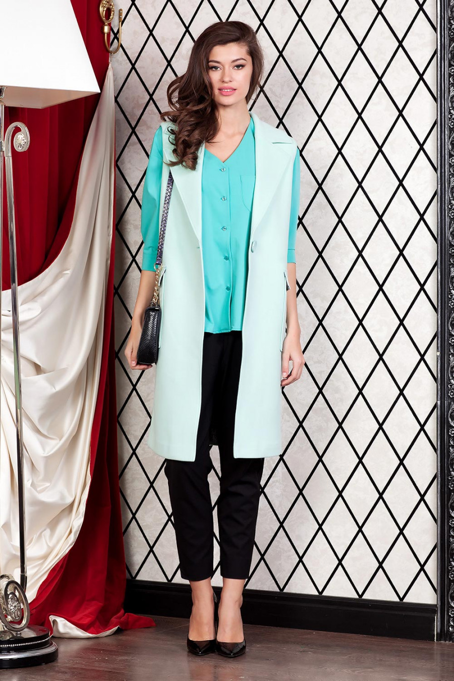 Стильный жилет из пальтовой ткани на подкладке. Модель объемная прямого силуэта с классическим воротником с лацканами и крупными накладными карманами по бокам. На спинке на уровне талии выполнен хлястик, закрепленный пуговицами. Застежка впереди на одну к...