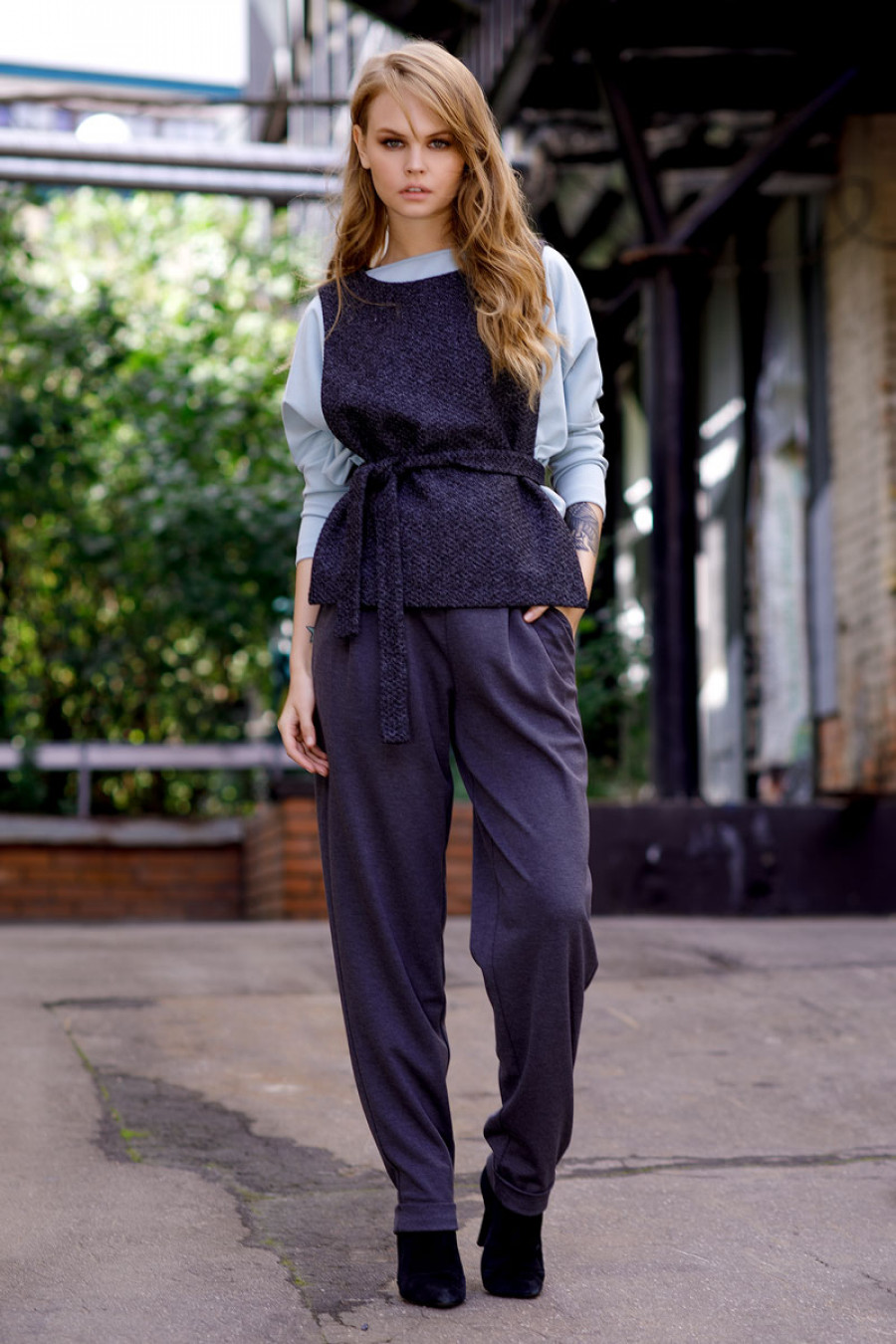 Укороченная туника-жилет из вязаного полотна на подкладке. Изделие прямого кроя с округлым вырезом горловины. Боковые швы не скреплены. На талии завязывается пояс.