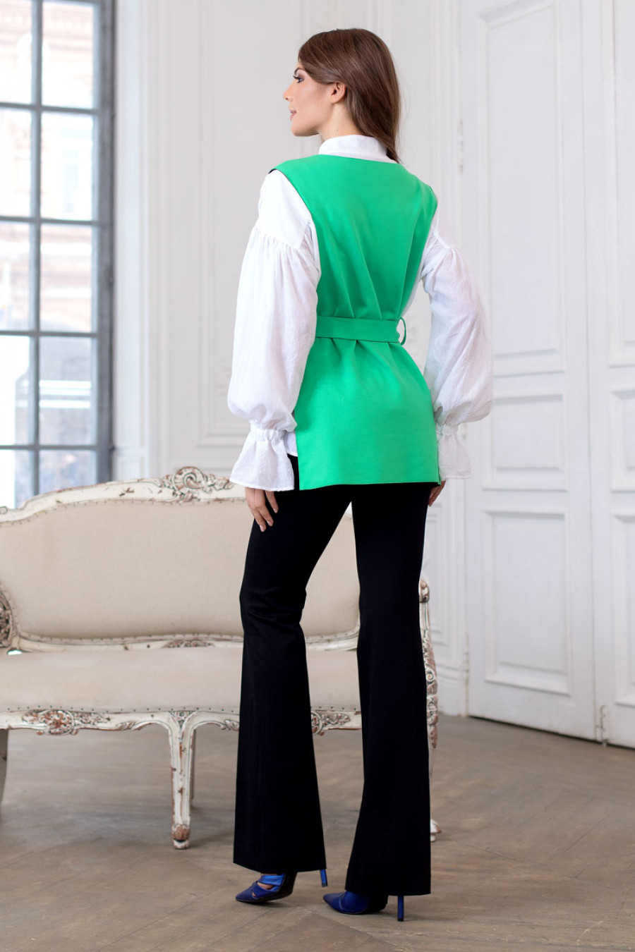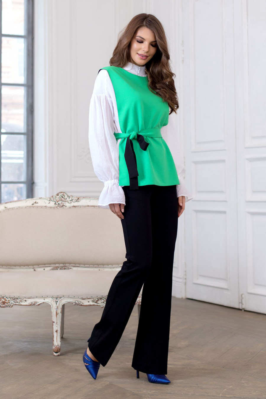 Оригинальный двусторонний жилет из однотонного джерси. Модель прямого кроя с округлым вырезом горловины. Боковые швы не скреплены. На талии завязывается пояс.