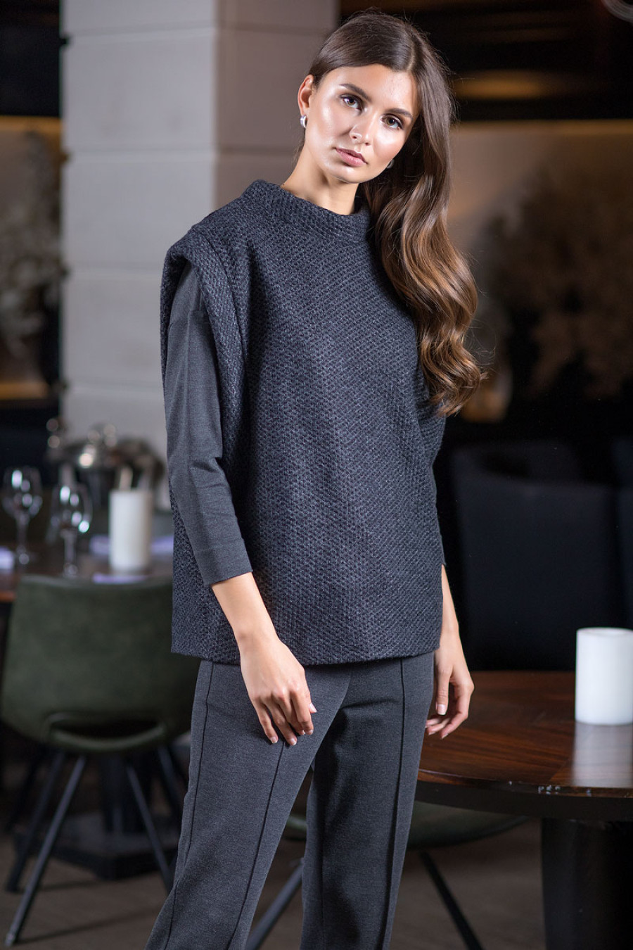 Стильный жилет из пальтовой ткани. Модель свободного кроя с глубокими объёмными проймами и круглой горловиной.